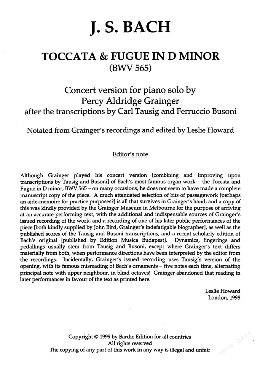 钢琴谱:改编巴赫作品 Bach-Grainger(Bach-Grainger bwv565 Toccata in d (after Busoni et al))