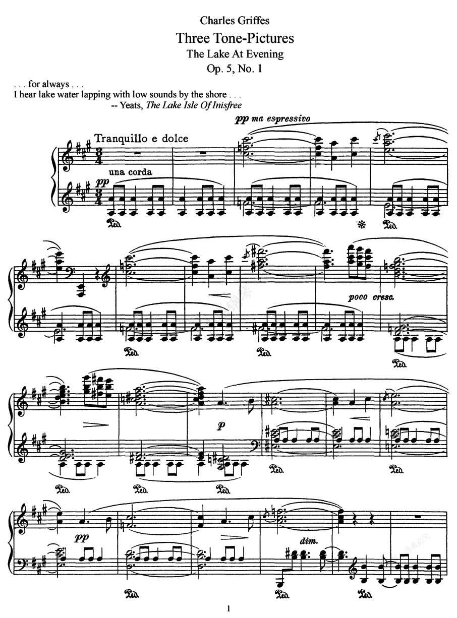 3幅音画 Three Tone Op.5《三幅音画》Three Tone Op.5 是格里菲斯发表的第一部钢琴作品,最先于1910年初版,经校正后,由布索尼推荐,斯克尔曼(G.) 于1915年正式出版这部作品。在这部作品中,格里菲斯融合了他早期的德国浪漫主义及独特的印象主义风格。在这些自然的音乐片断中可见丰富的半音变化、含糊的音调、独特的踏板技术、以及微妙的颜色和意象感觉。这些都充分表现出格里费斯是一位出色的微图画家及色彩大师。格里菲斯还为这三首音画各引用了一首诗歌。第一首“夜之湖” The Lake at ,引用了叶茨( Yeats) 的诗歌《茵尼斯弗利的湖岛》“The Lake Isle of” (1890): ……不止一次的……我听见湖水拍打岸边时发出低沉的呢喃第二首“梦之谷” The Vale of ,引用了波伊(Edgar Allen Poe) 的《沉睡者》"The" (1831) : 六月的午夜 我站在神秘的月光下 朦胧而湿润的雾气召人入睡 月之光环散发出银色的光辉 象水滴一般倾泻而下 在这安静的山顶上 睡意和乐声悄然潜入 无穷无尽的梦的山谷第三首“晚风” The Night Winds ,引用了波伊的另一首诗歌《湖》"The Lake -- To ----" (1827) : 当夜幕降临 繁星点缀 晚风轻拂 低吟着歌声 我会唤醒 这孤单之湖的恐惧