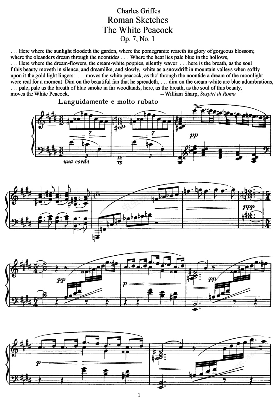 罗马素描 Roman Op.7《罗马素描》Roman Op 7 ,作于1917年。共有四首小品组成。1. 白孔雀 The White ,非常自由而无精打采的。2. 黄昏 ,神秘的慢板。和第一首《白孔雀》都极有可能是为了纪念德彪西而作。3. 威尼斯水上喷泉 The of Acqua Paola ,中速的快板。作品一开始就以一个动人的美国民歌旋律引出,随后是进入带有浪漫主义晚期风格的段落。4. 浮云 ,安详地。这是一首短小而秀丽的作品。