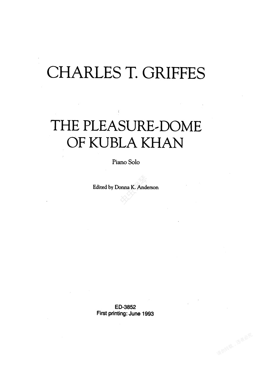 忽必烈汗的欢乐宫 The of Kubla Khan Op.8《忽必烈汗的欢乐宫》The of Kubla Khan Op.8 ,是格里菲斯最为精致和富于异国情调的作品,它以乐队交响诗的形式广为人知,事实上,它最初是为钢琴独奏而作,作于1912年,取材于柯勒律治()的一首著名的未完成的长诗。随后格里菲斯不断对这首作品进行修订,直到1915年,他在布索尼面前弹奏了这首作品后,布索尼建议将其改写成乐队形式。他接受了布索尼的建议,于1917年完成了这首交响诗的乐队版本,并于1919年由皮埃尔·蒙蒂尔斯()指挥首演,受到了极大的好评。同时也确立了格里菲斯在美国音乐史上的重要地位。作品采用B大调,6/4拍,神秘的。其中包括了格里菲斯所作的最为华丽多彩的片断,在演奏上也颇具难度。