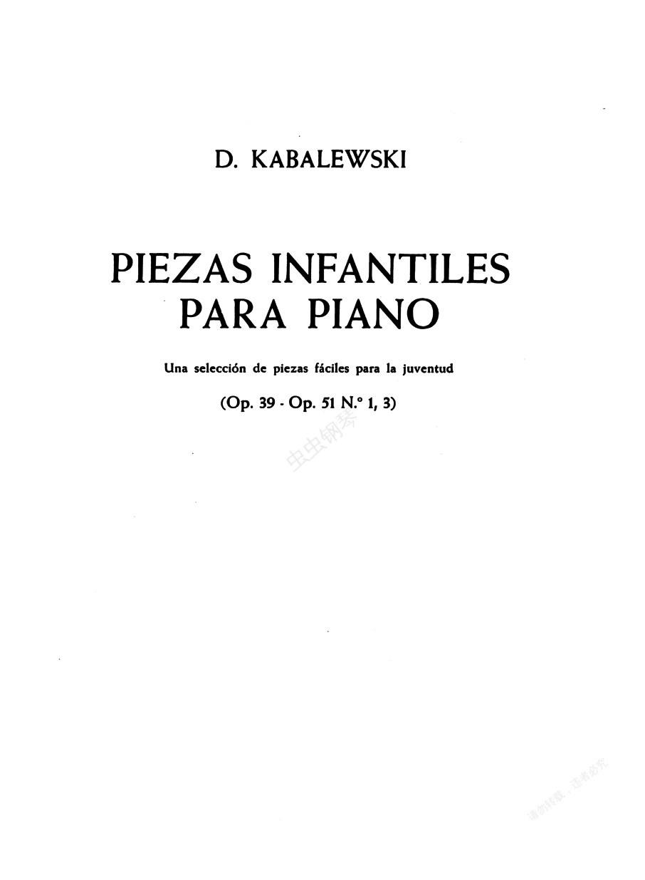 24首为孩子们而作的简易钢琴曲 24 for Op.39卡巴列夫斯基非常注重儿童青少年的音乐素质教育,他甚至还辞去音乐学院教授职务,致力于中小学音乐教育。时刻把握着“音乐教育--不是培养音乐家,首先是培养人”的主导思想进行音乐教育。这部于1986年出版的《二十四首儿童钢琴曲》24 for Op.39 ,全称“二十四首为孩子们而作的简易钢琴曲”,就是体现卡巴列夫斯基这一观点的代表作之一。1 歌谣 A Tune ,C大调,4/4拍,行板。2 波尔卡 Polka ,C大调,4/4拍,中速的快板。3 进行曲 ,d小调,4/4拍,进行曲速度。4 摇篮曲 Song ,e小调,2/4拍,稍慢而悠闲的行板。5 游戏 A Game ,降B大调,3/4拍,小快板。6 小谐谑曲 A ,C大调,2/4拍,活泼地。7 二重唱 The Twins ,G大调,3/4拍,精确的小快板。8 旋律 ,d小调,4/4拍,慢板。9 舞曲 Dance ,F大调,4/4拍,活泼地。10 进行曲 Quick March ,C大调,2/4拍,有力地。 11 秋之歌 Song ,b小调,2/4拍,如歌而连贯地。12 小游戏 A jest ,C大调,4/4拍,活泼地。 13 圆舞曲 Waltz ,d小调,3/4拍,中板。14 小故事 A Gay Story ,A大调,2/4拍,小快板。15 舞动 ,C大调,3/4拍,优雅的小快板。16 悲剧 A Sad Tale ,e小调,3/4拍,小行板。17 乡村舞曲 Dance ,D大调,2/4拍,活泼地。18 加洛普舞曲 ,C大调,2/4拍,快板。19 前奏曲 ,g小调,4/4拍,中速的快板。20 小丑 The Clown ,A大调,2/4拍,快板。是整部曲集中在国内最常见的一首。21 即兴曲 ,d小调,3/4拍,柔板。22 新事曲 ,a小调,2/4拍,轻快地。23 缓慢的圆舞曲 Waltz Lento ,a小调,3/4拍,平静的行板。24 愉快的旅行 A ,E大调,4/4拍,甚快板。
