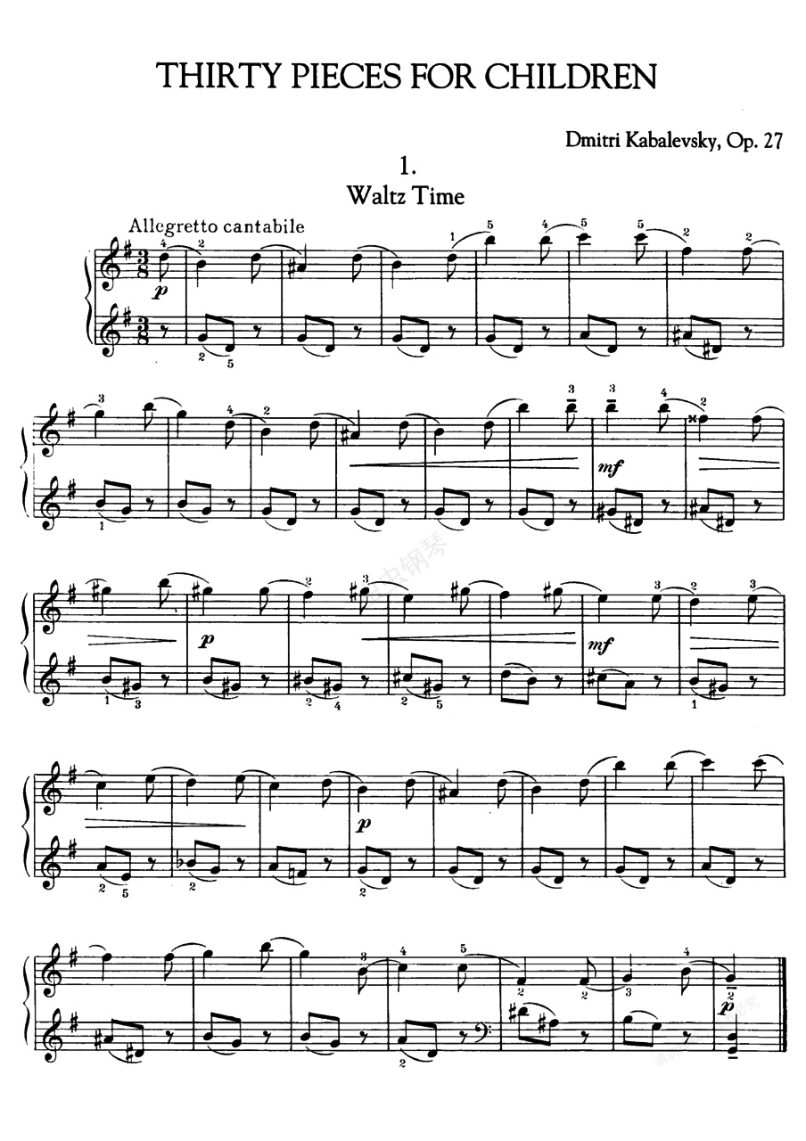 30首儿童钢琴曲 For Op.27《三十首儿童钢琴曲》 For Op.27 ,作于1937-1938年。1. 圆舞曲时代 Waltz Time ,G大调,3/8拍,如歌的小快板。2. 小曲 Ditty ,e小调,4/4拍,小行板。3. 练习曲 Etude ,a小调,4/4拍,活泼的快板。4. 河上之夜 At Night on the River ,b小调,3/4拍,小行板。5. 打球 Ball ,D大调,3/8拍,轻快活泼的。6. 伤感的故事 Sad Story ,f小调,2/4拍,如歌的。7. 古风舞曲 Old Dance ,a小调,3/4拍,小步舞曲速度。8. 摇篮曲 Song ,C大调,2/4拍,如歌的中板。9. 小寓言 Fable ,e小调,4/4拍,中庸的快板。10. 小丑 ,F大调,6/8拍,活泼的。11. 回旋曲 Rondo ,c小调,4/4拍,中板。12. 小托卡塔 ,a小调,2/4拍,小快板。13. 小恶作剧 A Prank ,C大调,2/4拍,活泼轻快的。14. 谐谑曲 ,b小调,3/4拍,谐谑的小快板。15. 进行曲 March ,降B大调,2/4拍,进行曲式快板。16. 抒情小品 Lyric Piece ,升c小调,4/4拍,稍快的小行板。17. 草甸之舞 Dance ,C大调,4/4拍,小行板。18. 小奏鸣曲 ,a小调,4/4拍,小快板。19. 战舞 War Dance ,f小调,4/4拍,有力的快板。20. 童话 Fairy Tale ,降E大调,4/4拍,如歌的小行板。21. 狩猎 The Chase ,g小调,2/2拍,中庸的快板。22. 故事 The Tale ,升f小调,2/4拍,小行板。23. 暴风雪 Snow Storm ,g小调,2/4拍,急板。24. 练习曲 Etude ,F大调,4/4拍,清晰的快板。25. 新事曲 ,d小调,6/8拍,非常连贯的。26. 练习曲 Etude ,A大调,2/4拍,快板。27. 舞曲 Dance ,d小调,2/4拍,谐谑的中板。28. 随想曲 ,E大调,2/4拍,小行板。29. 骑士之歌 Song of the ,降b小调,2/4拍,甚快板。30. 戏剧片断 ,f小调,2/4拍,庄板。