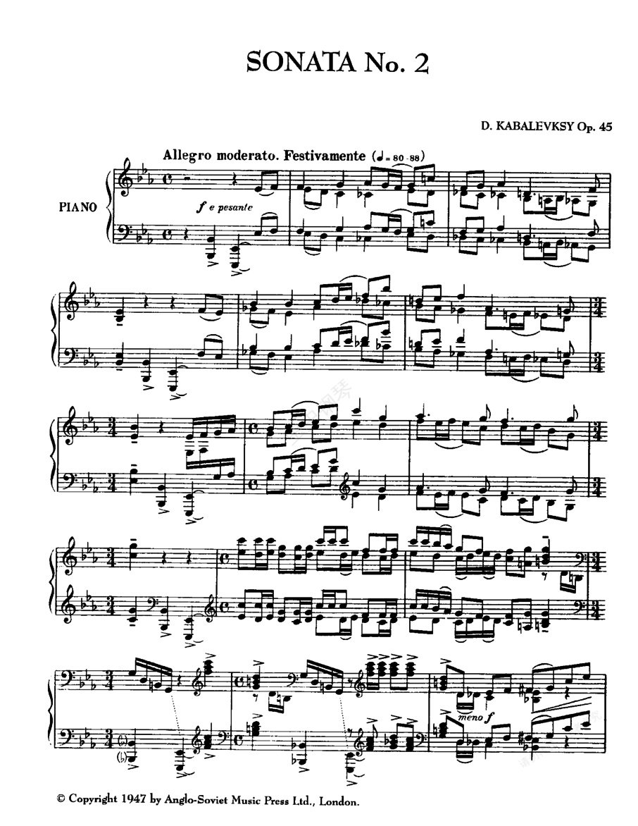 降E大调第二钢琴奏鸣曲 Piano No.2 in E flat Major Op.45卡巴列夫斯基是一位技艺精湛的钢琴家,他的钢琴作品很多,其中钢琴奏鸣曲共有三首,《第一钢琴奏鸣曲》Op.6 是在音乐学院学习时的作品,几乎没有人知晓,但是他的第二、第三钢琴奏鸣曲却是经常被演奏的作品。这部《降E大调第二钢琴奏鸣曲》Piano No.2 in E flat Major Op.45 ,作于1945年,其中的钢琴技巧非常充实,与同时期的普罗科菲耶夫的奏鸣曲并称为苏联音乐中的钢琴奏鸣曲典范。第一乐章,中庸的快板,欢乐地,降E大调,4/4拍,自由奏鸣曲式。创作此曲的1945年,正是苏联在第二次世界大战赢得胜利的一年,作品中拥有反映战争胜利的气息。开始由左手呈现的降E大调主和弦续接的第一主题形成如教会钟声般的音响。华丽地第一主题以渐快的速度形成高潮后,在D大调出现沉静的第二主题。展开部是甚快板,降e小调,开始左手在最低音部奏出断奏的分解和弦音形,右手也活动在低音区,这里展开的主题没有多大关系。之后再转为歌唱般的情绪,呈现类似第二主题发展的音形。随后速度变慢,进入再现部。第二乐章,行板,b小调,3/4拍,三部曲式。在4小节的引子之后,呈示出主部主题。中间部分在g小调,速度转快,清晰的旋律及其变形逐渐加强形成高潮,最后是带有华丽琶音装饰的再现。第三乐章,甚快板,降e小调,2/4拍,自由回旋曲式。在坚强并带有跃动感的引子之后,呈现活泼的回旋曲主要主题。第一插部主题为F大调,民歌风的旋律在分解和弦的伴奏下奏出,随后是强有力的突进。第二插部主题是降A大调,高亢地呈现出来,左手在七和弦上加重音,这是一个长大的乐段。最后乐曲在降E大调的和弦上结束。