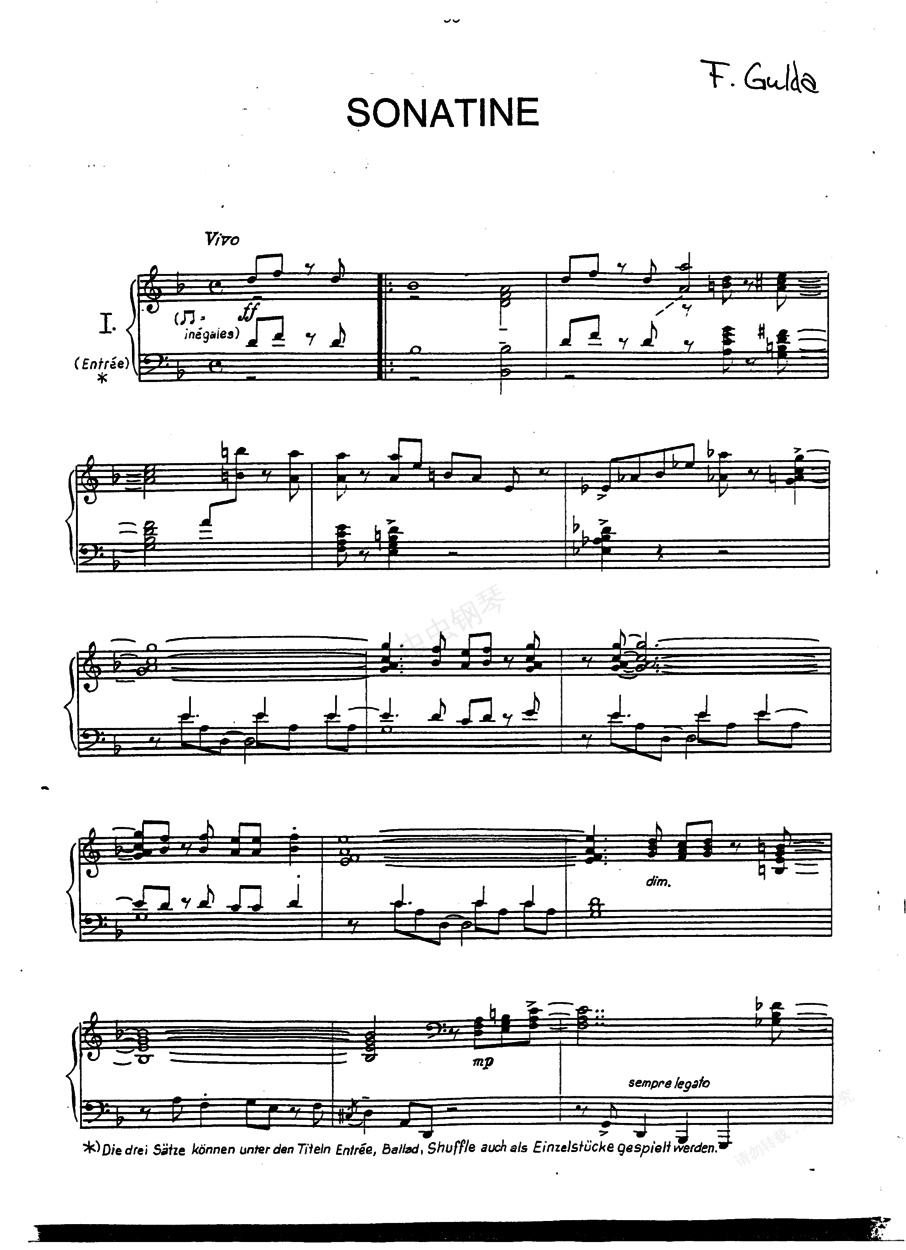钢琴小奏鸣曲 Piano《钢琴小奏鸣曲》Piano ,作于1903-1905年,d小调,共三个乐章:第一乐章 序曲 ,活泼的,d小调,4/4拍。第二乐章 抒情诗 ,小广板,降B大调,3/4拍,左手部分几乎是根据和弦即兴发挥,无实际记谱。第三乐章 切分 ,蓝调切分节奏,D大调,4/4拍。其中尾声前的段落右手部分无实际记谱,需演奏者根据和弦自由发挥。 节奏即传统蓝调的基本节奏,就是将三连音中间的音剔除,形成重复拖曳的一种切分节奏。