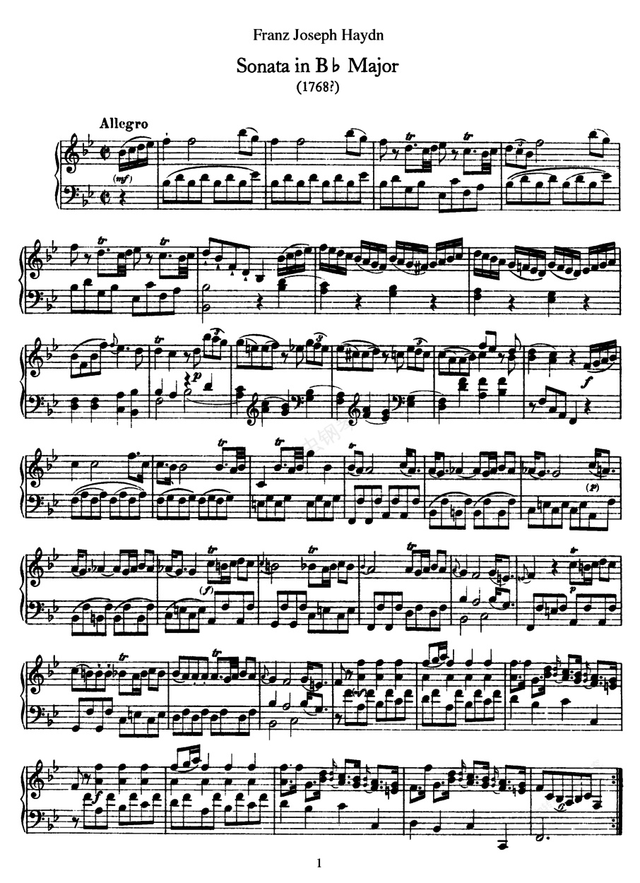 52首钢琴奏鸣曲 52 Piano海顿一生中创作了多少首钢琴奏鸣曲,这是没人能说得清的,但可以确定的是,钢琴奏鸣曲是在海顿笔下得到初步完善和确立了基本形式的。具体表现在整体上由多乐章组成,其中至少有一个乐章(通常是第一乐章)用奏鸣曲式写成。而奏鸣曲式已经是有对比主题组成的呈示部,之后的发展部(又称展开部),接着是对比主题在同一调性上的再现这种三段体的形式。后来莫扎特、贝多芬的钢琴奏鸣曲,都是建立在海顿确立的基本格式之上的。海顿的《钢琴奏鸣曲》Piano 属于早期古典乐派的作品,但这五十多首作品从前后来看风格和形式都不尽相同。从形式上看,虽多采用三个乐章“快-慢-快”的分配,但除了第一乐章多数采用奏鸣曲式外,后面两个乐章曲式多有不同。其第二乐章也常采用奏鸣曲式。在风格上,海顿已经完全脱离了斯卡拉蒂时代的华丽。虽然海顿是从巴赫的儿子K.P.E.巴赫那里学来的钢琴作曲法,他却没有继续巴赫在音乐理论方面的探索,特别是在复调的运用上。海顿的奏鸣曲旋律流畅,充满了更多的是宫廷而不是民间的味道。虽然采用了奏鸣曲式,但其不同主题间既没有对比也没有冲突,连情绪上的变化都非常小。从社会背景上分析,这一时期的音乐仍然多数是为宫廷贵族服务的,需求决定了内容,所以这就注定了海顿的钢琴奏鸣曲体现的是一种雅致、平静和快乐的音乐。由于从小接触民间音乐,使海顿钢琴奏鸣曲的主题多具有活跃、生气勃勃的特点。这也反映出海顿性格中乐观开朗的一面。所以,不同主题间的对比并不强烈,仿佛都是同一类颜色,只是深、浅、明、暗的程度不同。这些特点,在早期作品中更为多见。海顿的中期,尤其是晚期奏鸣曲,一方面受到莫扎特的影响,一方面也是他在不断深入新境界,音乐风格有所改变,增加了抒发内心深处情思的、甚至是带有悲剧性的因素。海顿在结识莫扎特之前已经完成了约四十首的钢琴奏鸣曲,而莫扎特那时也已经完成了十首左右。和莫扎特的钢琴奏鸣曲相比较,从风格上看,有很多相似的地方。但海顿的钢琴奏鸣曲和莫扎特的相比,缺少了一种精致。而且,其形式的不连续性也使人们对他的创作发展颇多迷惑。这或许也是海顿的奏鸣曲没有莫扎特的作品演奏得那么广泛的原因之一。尽管很长时间内,演奏家们没有把注意力的重点放在海顿的奏鸣曲上,但还是有不少作品可以经常在音乐厅里听到。而且这种趋势显然还在不断增加。