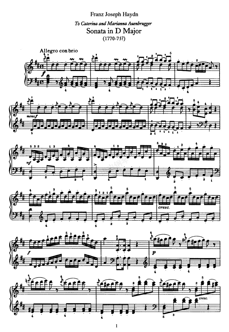 52首钢琴奏鸣曲 52 Piano海顿一生中创作了多少首钢琴奏鸣曲,这是没人能说得清的,但可以确定的是,钢琴奏鸣曲是在海顿笔下得到初步完善和确立了基本形式的。具体表现在整体上由多乐章组成,其中至少有一个乐章(通常是第一乐章)用奏鸣曲式写成。而奏鸣曲式已经是有对比主题组成的呈示部,之后的发展部(又称展开部),接着是对比主题在同一调性上的再现这种三段体的形式。后来莫扎特、贝多芬的钢琴奏鸣曲,都是建立在海顿确立的基本格式之上的。海顿的《钢琴奏鸣曲》Piano 属于早期古典乐派的作品,但这五十多首作品从前后来看风格和形式都不尽相同。从形式上看,虽多采用三个乐章“快-慢-快”的分配,但除了第一乐章多数采用奏鸣曲式外,后面两个乐章曲式多有不同。其第二乐章也常采用奏鸣曲式。在风格上,海顿已经完全脱离了斯卡拉蒂时代的华丽。虽然海顿是从巴赫的儿子K.P.E.巴赫那里学来的钢琴作曲法,他却没有继续巴赫在音乐理论方面的探索,特别是在复调的运用上。海顿的奏鸣曲旋律流畅,充满了更多的是宫廷而不是民间的味道。虽然采用了奏鸣曲式,但其不同主题间既没有对比也没有冲突,连情绪上的变化都非常小。从社会背景上分析,这一时期的音乐仍然多数是为宫廷贵族服务的,需求决定了内容,所以这就注定了海顿的钢琴奏鸣曲体现的是一种雅致、平静和快乐的音乐。由于从小接触民间音乐,使海顿钢琴奏鸣曲的主题多具有活跃、生气勃勃的特点。这也反映出海顿性格中乐观开朗的一面。所以,不同主题间的对比并不强烈,仿佛都是同一类颜色,只是深、浅、明、暗的程度不同。这些特点,在早期作品中更为多见。海顿的中期,尤其是晚期奏鸣曲,一方面受到莫扎特的影响,一方面也是他在不断深入新境界,音乐风格有所改变,增加了抒发内心深处情思的、甚至是带有悲剧性的因素。海顿在结识莫扎特之前已经完成了约四十首的钢琴奏鸣曲,而莫扎特那时也已经完成了十首左右。和莫扎特的钢琴奏鸣曲相比较,从风格上看,有很多相似的地方。但海顿的钢琴奏鸣曲和莫扎特的相比,缺少了一种精致。而且,其形式的不连续性也使人们对他的创作发展颇多迷惑。这或许也是海顿的奏鸣曲没有莫扎特的作品演奏得那么广泛的原因之一。尽管很长时间内,演奏家们没有把注意力的重点放在海顿的奏鸣曲上,但还是有不少作品可以经常在音乐厅里听到。而且这种趋势显然还在不断增加。