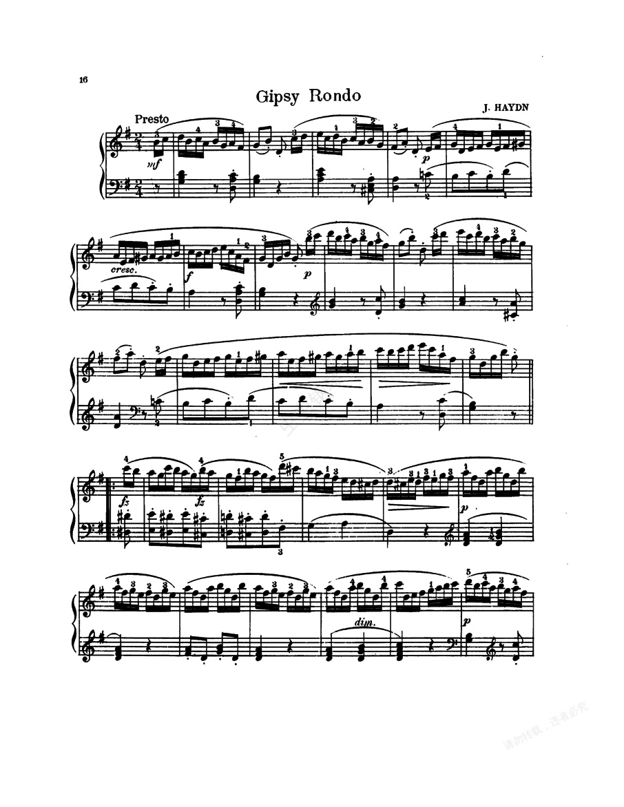 吉普赛回旋曲 Gipsy Rondo - 选自《G大调第三十九钢琴三重奏》《吉普赛回旋曲》Gipsy Rondo 是国内钢琴考级中常见的作品。这首作品其实是根据海顿作于1795年的《G大调第三十九钢琴三重奏》Piano Trio No.39 in G Major 的第三乐章“终曲” 改编而成的钢琴独奏作品,因作品为回旋曲式,并带有鲜明的吉普赛舞曲风格,故命名为“吉普赛回旋曲”。G大调,2/4拍,回旋曲式,结构是ABACA,模仿吉普赛的风格。演奏A部分手指的独立性要强,B段以很强烈的和弦开始,进入小调,略带火气,需要演奏力度,体现吉普赛民族粗犷的特点,但要保持欢快的感觉。回到A部分,轻快的感觉又出现。C部分热烈,左手的节奏很又特性,要留意。B部分中间的对比句在力度上要又强烈的对比。结束的部分很热烈。另外,要很好的注意分句的准确和语气的表达。