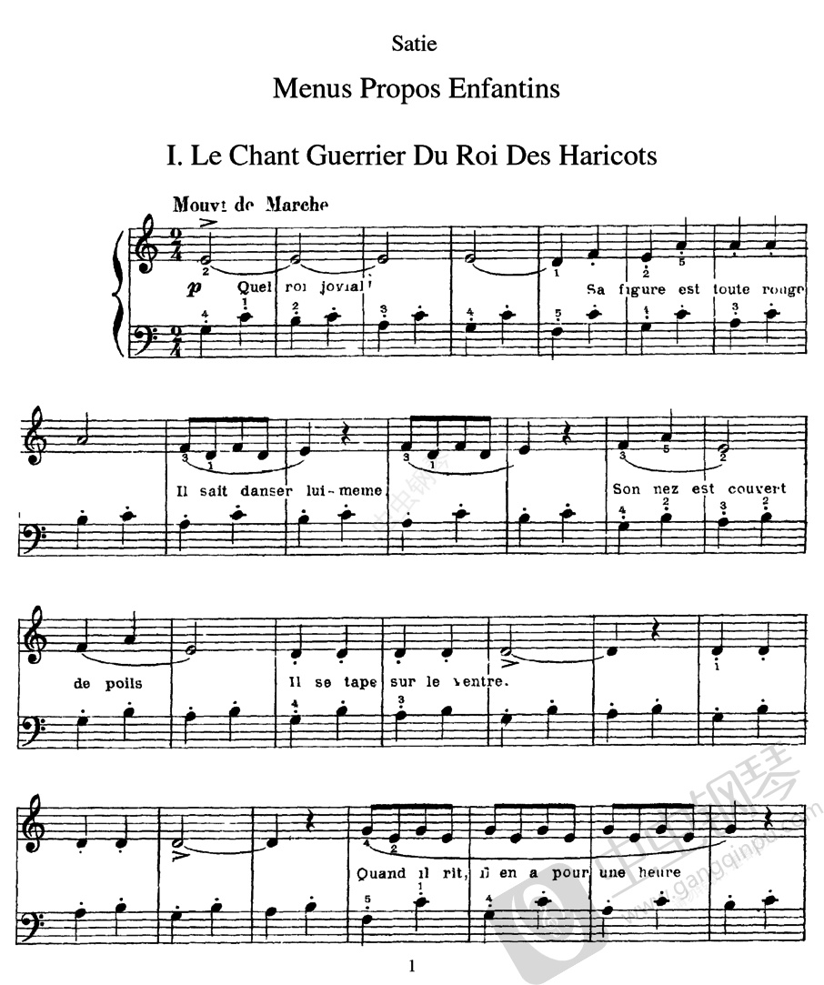 儿童小品 Menus《儿童小品》Menus ,又译“小小童话”,是萨蒂于1913年为儿童创作的三部钢琴曲集中的第一部(另两部在前面已经介绍),由三首小曲组成。1. 豌豆国王的战歌 La chant du roi des ,C大调,2/4拍,进行曲速度。2. 郁金香小公主如是说 Ce que dit la des ,a小调,4/4拍,甚慢板。3. 杏仁巧克力圆舞曲 Valse du aux ,C大调,3/4拍,圆舞曲速度。