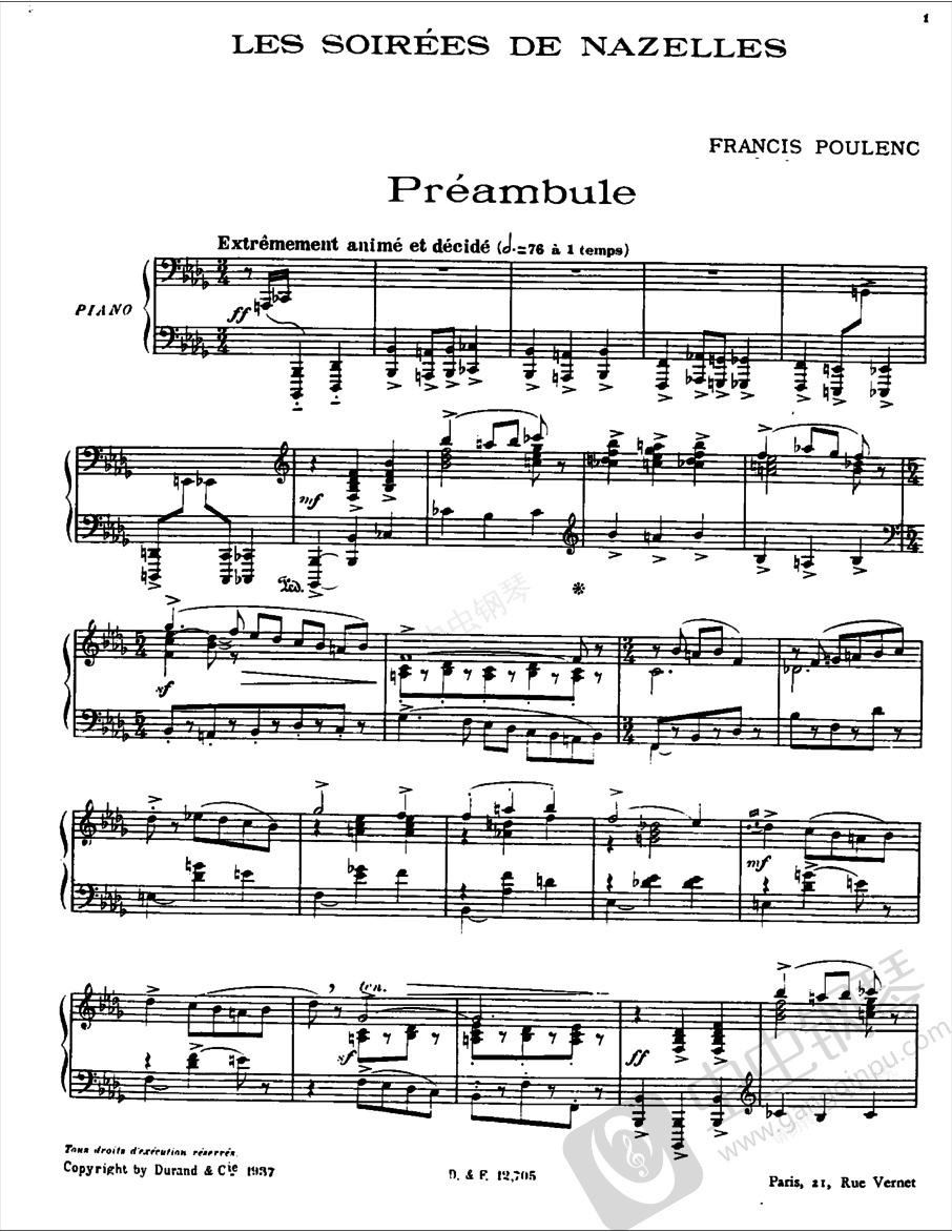 《纳泽尔之夜》Les De ,又译“纳泽尔晚会”,“纳粹集中营之夜”,始作于1930年,最终于1936年10月1日完成,是为了纪念维吉尼亚•李尔纳德( Liénard),以及回忆纳泽尔的夜晚而作。维吉尼亚•李尔纳德是普朗克在杜兰()镇相识的好朋友,在那里普朗克曾写下钢琴组曲《漫步》 。《纳泽尔之夜》整个作品包括序曲、八个变奏、终止式以及终曲。其中的变奏部分就是在纳泽尔乡村的漫漫长夜中想念自己的朋友即席演奏而成。其序曲和终曲让人联想到当年在杜兰镇乡村别墅的沙龙晚会,其中有福雷、夏布里埃、圣桑以及奥芬巴赫等人优雅而高贵的舞步。这是普朗克最重要的一部钢琴独奏曲,全曲充满愉悦和幽默的气氛,要求全面的演奏技巧。1. 前奏曲 ,非常果断而生动的-广板华彩,降b小调,3/4拍。 2. 变奏一“贵客满座” 1: Le de la ,活泼而欢快的,g小调,4/4拍。3. 变奏二“深情地握手” 2: Le coeur sur la main ,中板,c小调,6/8拍。4. 变奏三“朴素和大方” 3: La et la ,急板,G大调,2/2拍。5. 变奏四“联想翩翩” 4: La suite dans les idees ,庄重的广板,4/4拍。 6. 变奏五“迷人的舞蹈” 5: Le ,非常活泼的,升f小调,6/8拍。7. 变奏六“孤芳自赏” 6: Le de soi ,生硬的甚快板,C大调,2/4拍。8. 变奏七“烦恼的滋味” 7: Le gout du ,伤感的慢板,降e小调,4/8拍。9. 变奏八“灵活的老人” 8: L' ,生硬的甚快板,a小调,2/2拍。 10. 华彩段 ,非常自由的广板。11. 终曲 Final ,非常清晰而火热的甚快板,A大调,4/4拍。