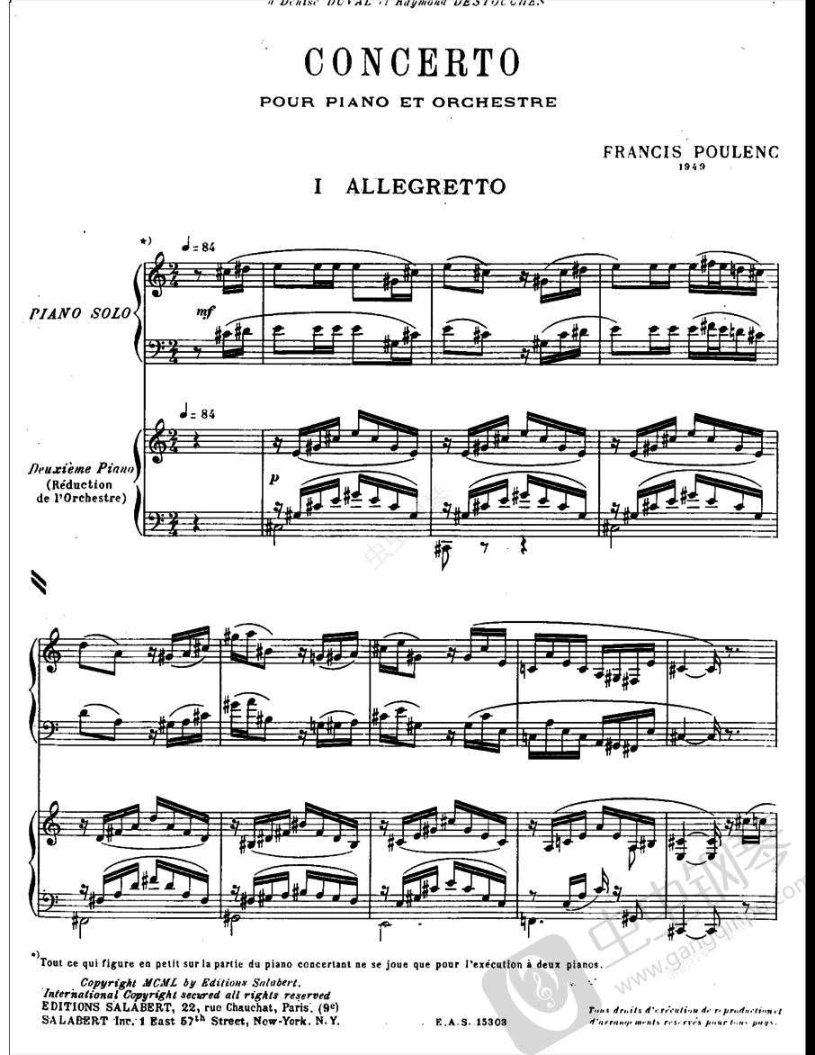 升c小调钢琴协奏曲 Piano in Minor《升c小调钢琴协奏曲》Piano in Minor ,作于1949年,题献给丹尼斯·杜瓦尔和雷蒙·德图什( Duval et),于1950年1月6日由普朗克本人首演。在这部三乐章的作品中,普朗克回归到他早年的清新风格,从整体上看,钢琴在其中担任的角色并不是凌驾乐队之上,而是和乐队紧密结合,密不可分的一部分。第一乐章,小快板,升c小调,2/4拍。开头由钢琴齐奏的旋律引人入胜,是普朗克所作最动人的乐章之一。第二乐章,甚快的行板,降E大调,4/4拍。第三乐章“法国回旋曲” A La ,欢乐的急板,升c小调,2/4拍。其中有引用福斯特()的歌曲《斯瓦尼河》 River 的旋律。