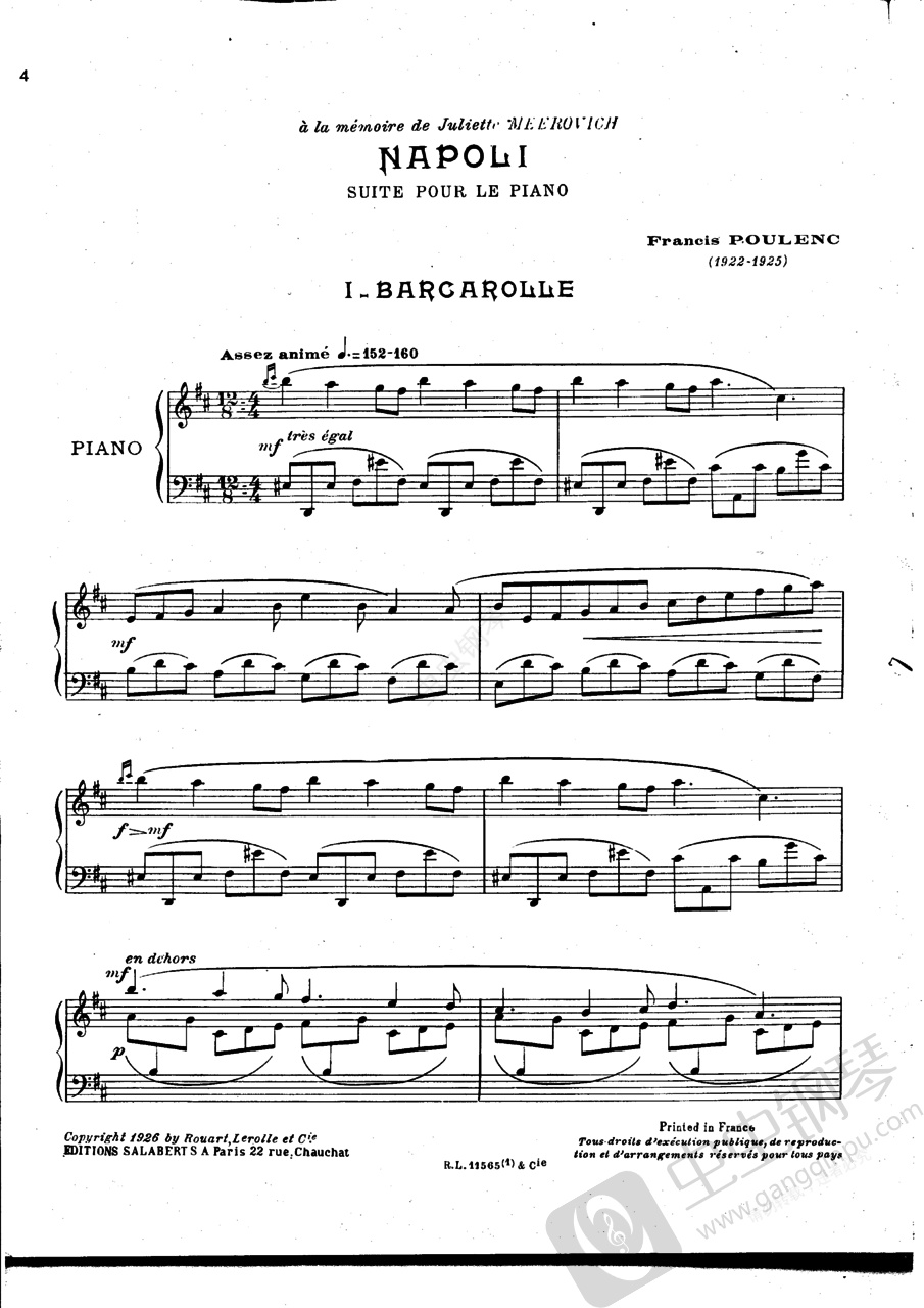 《拿波里组曲》Suite ,又称“那不勒斯组曲”,始作于1922年在意大利旅行之时,于1925年9月在纳泽尔完成,全曲由玛莎勒•梅耶尔( Meyer)于1926年5月2日在巴黎首演。共由三首曲子组成:1. 船歌 ,D大调,12/8拍,非常生动的。这是极具流动性的一首歌谣。2. 夜曲 ,降D大调,6/8拍,慢板。与第一首的速度形成对比,但同样是奏出如歌的旋律。3. 意大利随想曲 ,E大调,2/8拍,急板。这是一首需要高难度技巧演奏的华丽的作品,描绘的是喧闹的那不勒斯。普朗克自己解释道,这是和夏布里埃的《幻想布列舞曲》同一类风格的舞曲作品。