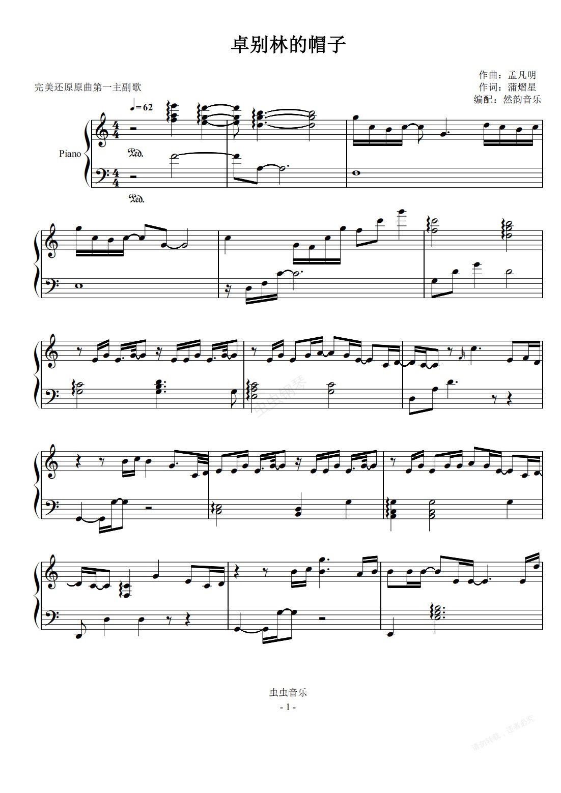 钢琴谱:【C调】卓别林的帽子-蒲熠星 钢琴完美独奏《我的世界写了你》网剧主题曲