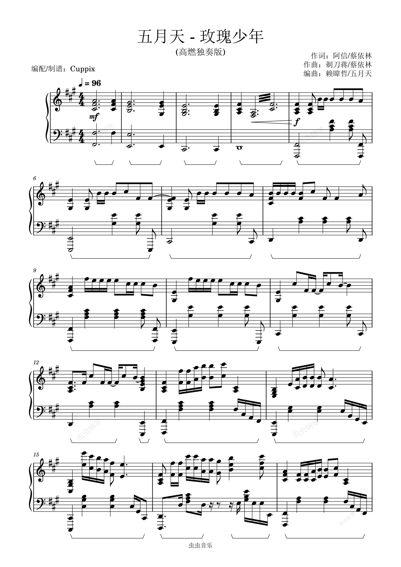 钢琴谱:五月天《玫瑰少年》Cuppix编配-高燃独奏版
