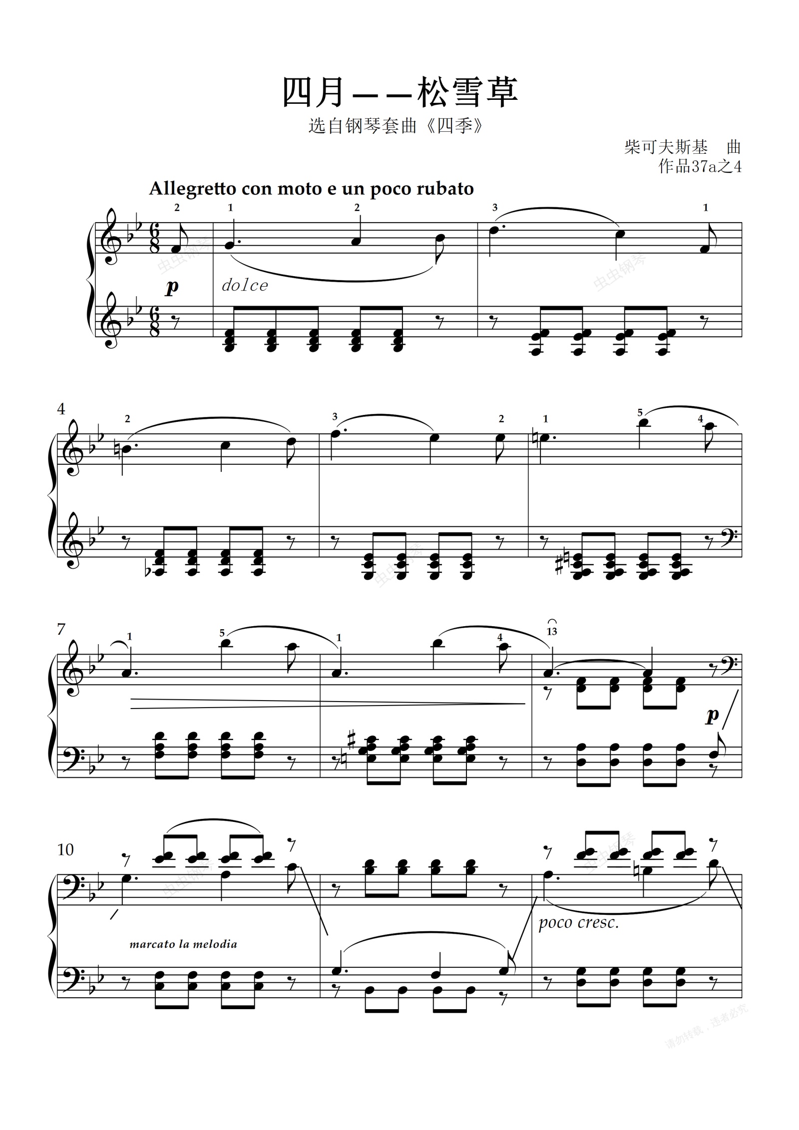 四月《松雪草》充满了春天的气息,这是一首非常短小精湛的乐曲。松雪草在俄罗斯初春的严寒中勇敢地吐露新芽,是俄罗斯人眼中新生活、新追求、新生命的象征,很多俄罗斯人都赞美它。这首曲子实际上是借松雪草来表达作曲家心中的希望。