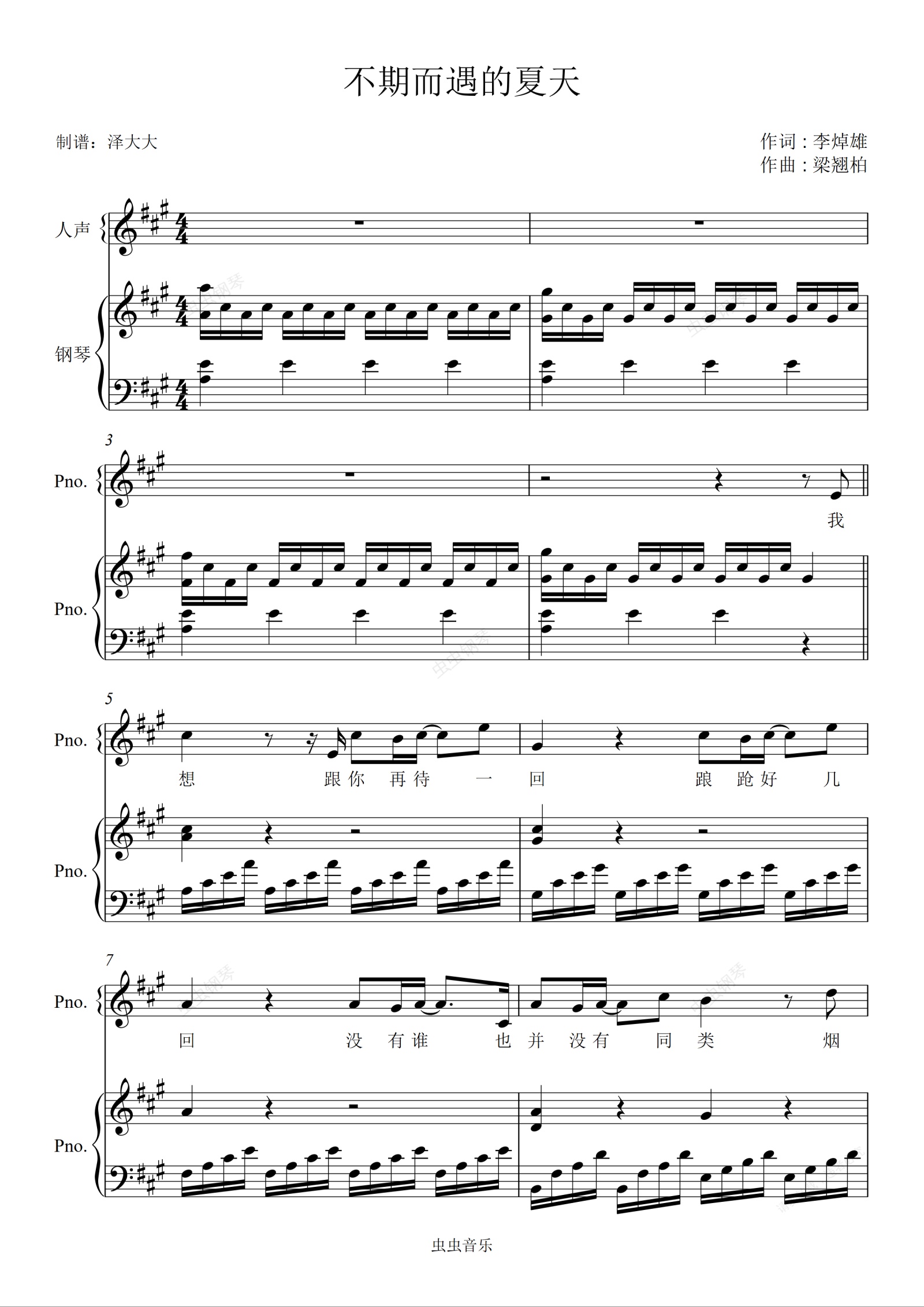 钢琴谱:不期而遇的夏天【女生A调弹唱附词】泽大大 陈奕迅