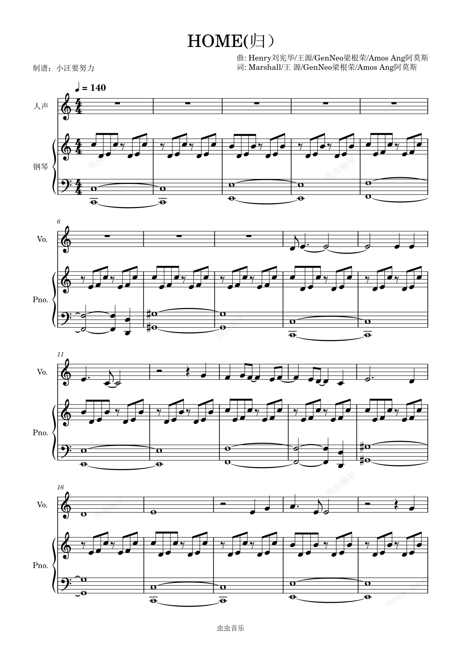 钢琴谱:HOME(归)-王源/刘宪华 C调钢琴谱