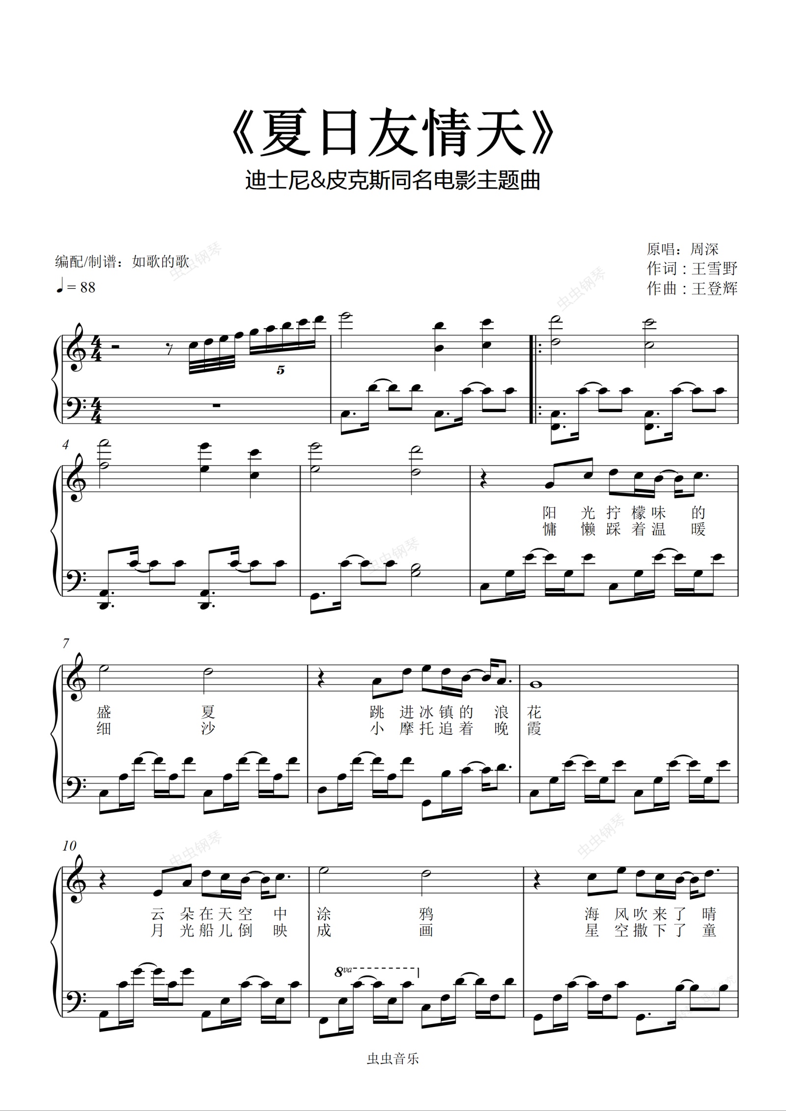 钢琴谱:夏日友晴天C调带歌词-迪斯尼&皮克斯动画电影同名主题曲-周深