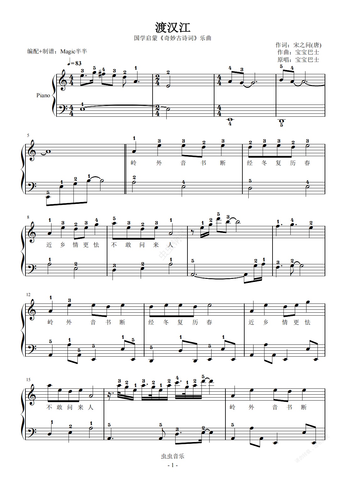 钢琴谱:奇妙古诗词/渡汉江(带指法)