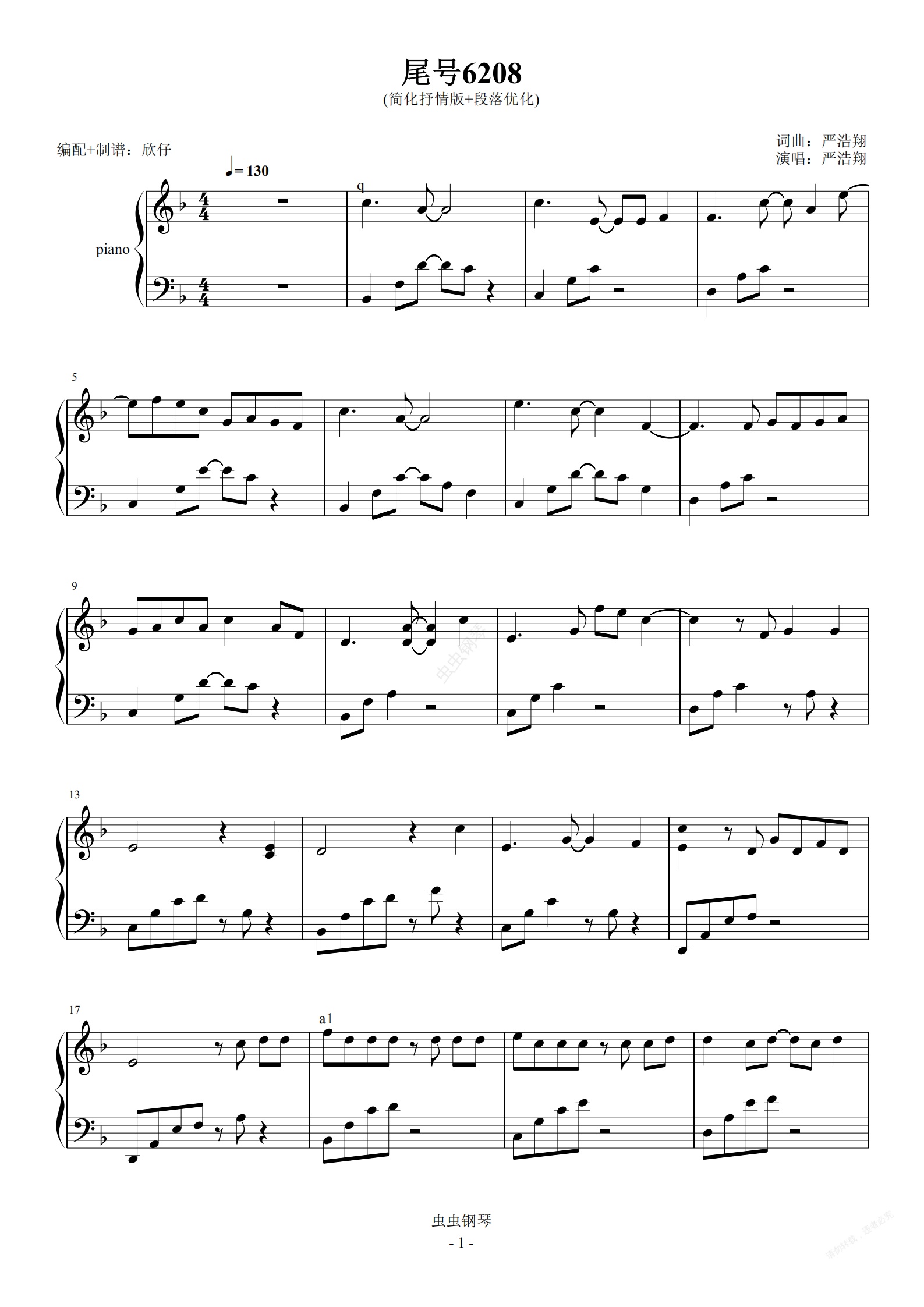 钢琴谱:严浩翔-F《尾号6208》(简化抒情版+段落优化)