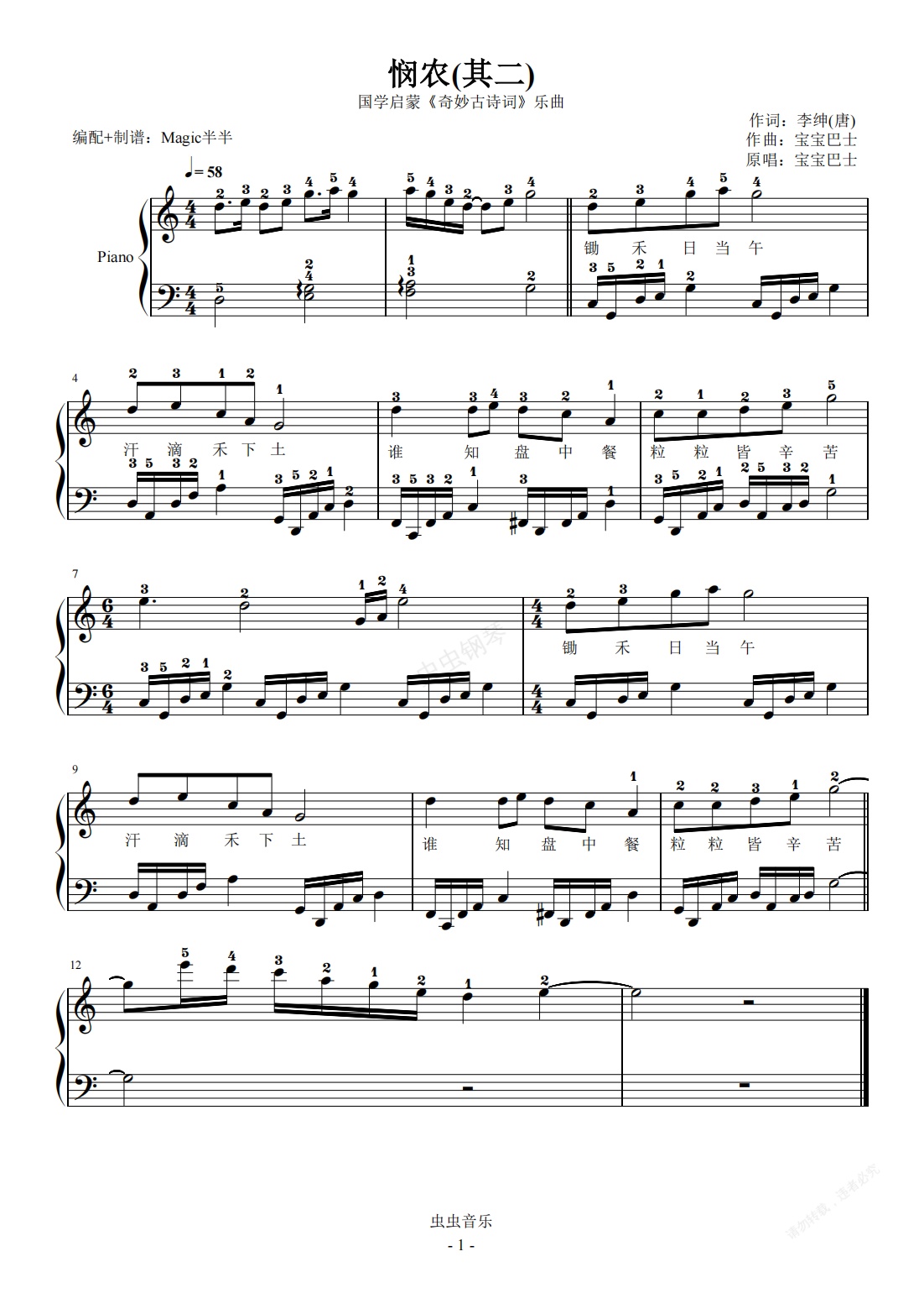 钢琴谱:奇妙古诗词/悯农(其二)(带指法)