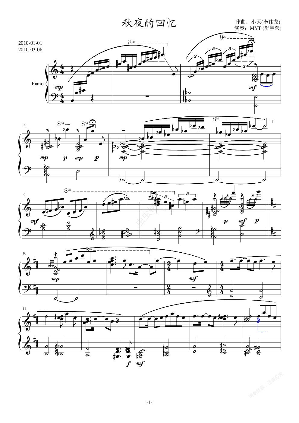 谢谢MYT一直对TXQ的支持~ 这个曲子送给MYT。 非常感谢MYT的演奏。 45~53小节可以不用弹那么快。(因为我弹不到,哈) 86小节那里注意那个很难看见的休止符。 呵,演奏应该那里出了点小错误。 当然演奏的时候是很看演奏人心情的。 所以开头的节奏可以非常自由。 再次感谢MYT啦~~ 曲子是花了很久才写完,应CG很久前的留言:这次进行了风格的创新。 曲子的难度也不小~ 希望大家喜欢吧~