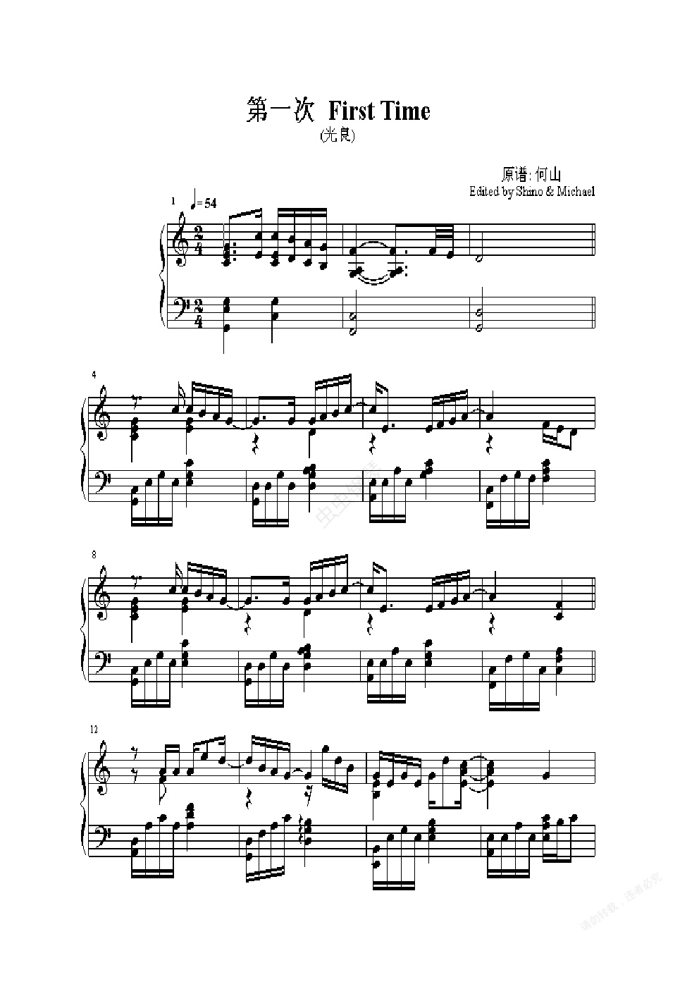 ------------------------------------------------------------------------------- 歌曲名:第一次 歌手/乐队:光良 编配者(转载来源):网络 曲调:1=C ------------------------------------------------------------------------------- C G Am F 当你看着我 我没有开口 已被你猜透 C G Am F 还是没把握 还是没有符合 你的要求 Dm Em Em Am 是我自己想得太多 还是你也在闪躲 Dm Em C Am 如果真的选择是我 我鼓起勇 去接受 Dm G C 不知不觉让视线开始闪 C G Am F 喔 第一次我 说爱你的时候 呼吸难过 心不停地颤抖 C G Am G 喔 第一次我 牵起你的双手 失去方向 不知该往哪儿走 G C Dm G 那是一起相爱的理由 那是一起思守 C G Am Dm 喔 第一次吻 你深深的酒窝 想要清醒却冲昏了头 C G Am G 喔 第一次你 躺在我的胸口 二十四小时没分开过 G G C 那是第一次知道 天长地久 Am G G Am 感觉你属于我 感觉你的眼眸 Am G Em 第一次就决定 决不会错