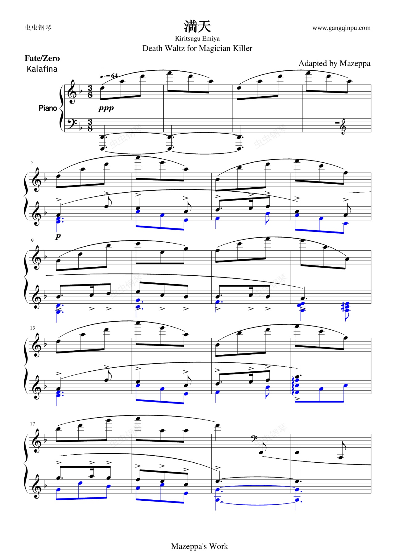 这是我编配过的所有曲子里面最难驾驭的。带有着卫宫切嗣式的忧郁。作为一个魔术师杀手,切嗣显然已经忘记了自己曾经是一个独立的人。或者说,他的宿命就是一个人。年少的时候被夏莉抛弃,后来又亲手杀死自己的父亲。被魔术师杀手娜塔莉亚培养,后来又亲手杀掉了娜塔莉亚。同爱丽斯菲尔结合参加第四次圣杯战争,却因为自己无法接受圣杯黑暗的本质而又亲手毁灭了爱丽斯菲尔所代表的圣杯。于是乎,又一个人了。记得当时看到卫宫切嗣用地对空导弹击落了满载食尸鬼的飞机后,在大西洋上恸哭的场景,然后配着“滿天”这首歌,身上不禁一阵阵的颤栗,觉得一阵巨大的孤独感,一种注定要背负这个世界上所有的恶的无奈,如同洪水般袭来。。。不说什么了,请各位FZ迷慢慢享用。