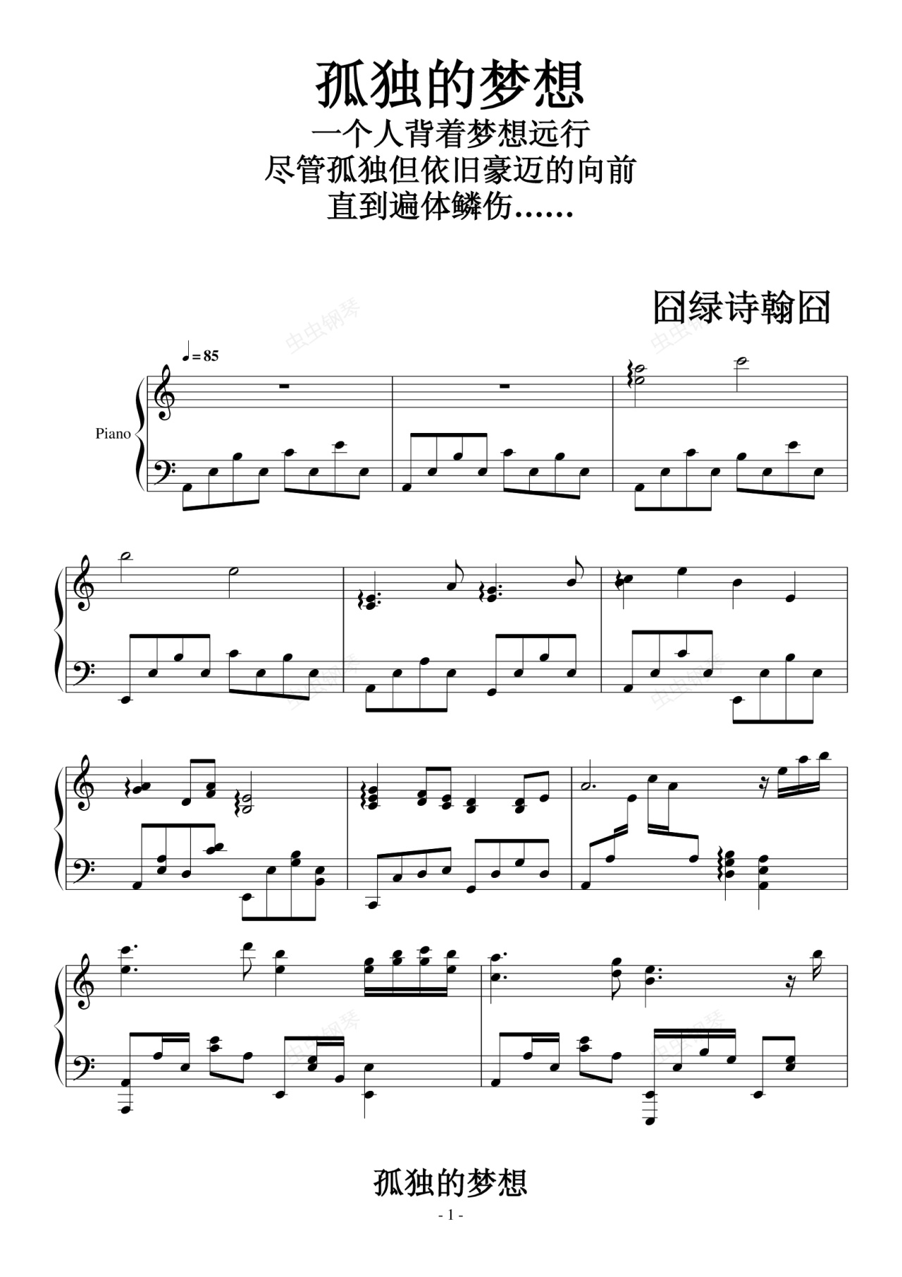 近来心情不是很好……因为我慢慢的体会到梦想在现实面前不堪一击……     年轻气盛的我曾不顾一切的去拼,不管结果如何……现在回头想想……很高兴也很无力……无意间的回首,才知道自己走远了,但前方还很远,很远……     我不知在何时……在逐梦中失去了许多……     有时候,我一直问自己,为什么逐梦     我的回答很明确……     但在现实面前,     梦想变得飘渺。 ——但我依旧孤独的向前走着,傻笑着,豪迈的向前走着……     也许在哪一天,我会被钉死在现实的十字架上……     也许在某一天,我会到达一个充满圣光的地方…… 但——现在我已遍体鳞伤……拖着沉重的脚步走在陌生的丛林…………………………………………………………………………………………………………………………………………………………     *没有时间和心思去写关于此时此刻心情的曲子,不过曾发过的《夏夜·躁动》的作曲缘由是同一个心情,所以就把曲子修改下和声再上传……     *谢谢支持关注、支持和帮助小翰的虫友们!谢谢!     *这是小翰自学的最后一首曲子,本来还有一首海的钢琴曲4的,算了,因为特殊原因,小翰会离开虫钢一段时间,也许小翰会错过很多虫友的好作品,在此道声抱歉。