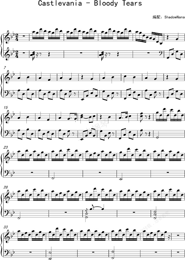 呵呵,前段时间尬哥上传了好几部恶魔城的作品啊。。。虽然都很好。但都是没有我最喜欢的这首啊。这首才是我的最爱~谱面乱,抱歉。不知道为什么,ove做谱导出midi,再导入midi于Sib。。。然后谱面就成这样饿了= = 其实导完之后比这个还要难看许多。虽然没有都修改完。但是大多数还是可以了。这个谱子我扒下来大部分。。。发现有个前辈已经拔过了。。。哎,自认没有他的好。但是可怜自己的劳动成果,还是放上来吧。音频采用那个前辈的谱子一样的音频,因为扒的都是一个。。。嗯,就这样了。