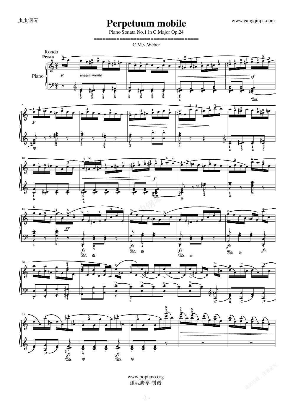 Piano  No.1 in C Major Op.24 ,作于1812年。共四个乐章。其中最后一个乐章即为著名的 “无穷动”  ,经常被单独演奏。