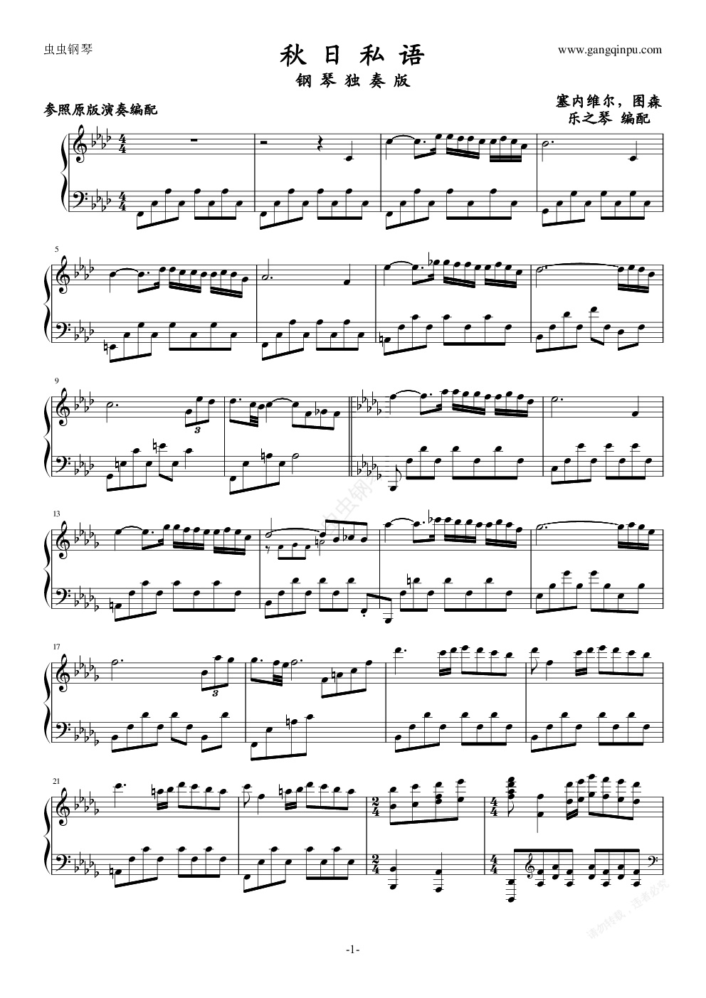 现在秋日私语版本满天飞。。。但是实在找不出可以用来演奏的,许多谱子都是照着那本理查德克莱德曼钢琴曲集直接打谱抄上的。并没有修改其中的错误。例如,我们在第8小节,演奏中明显在最后一拍第一个左手音上是低音2,而所有版本几乎都忽略过去,第9小节第三拍左手是还原3,这个是极度明显的,而大多数版本都将其忽略简化到重复1这个音。其中14小节弦乐部分旋律担当重要效果,所以写成两个声部小音符指出加了进去。19小节与20小节演奏效果是不同的,而除了我见过的一本书,其他均处理成相同。第26小节右手第一个音,如果仅仅处理成八度就会显得单薄和刺耳。第40,43,46三个小节富于激情的右手,你是否听到演奏中的钢琴不仅仅是八度而且中间加了三度和弦呢?左边原版演奏你可以听一下。而且仔细听其左手伴奏以及乐队效果,与很多版本大相径庭,有的版本显得伴奏音与旋律之间完全两层或者和弦太低,和弦的旋律音可以听出是与本多版本不同的。最后就是50至54小节,因为是钢琴独奏版,所以50、52、53小节因为加入贝斯节奏,所以显得不漂浮,于是把钢琴音向下拉一个八度效果与乐队相仿而不会显得所有音漂浮于高音区域。