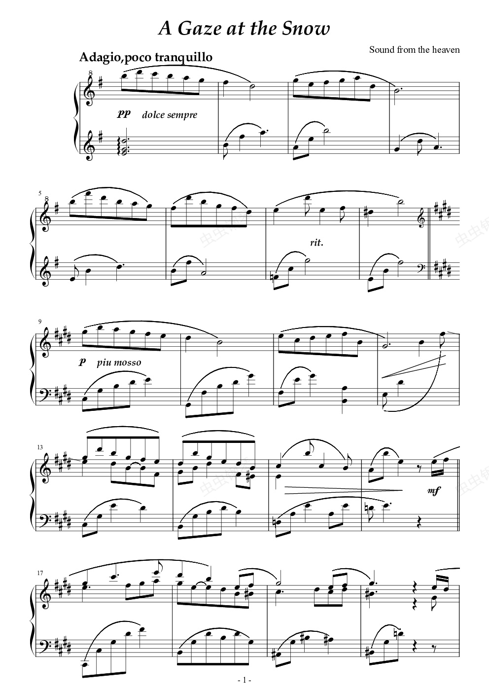 1月25日左右这里下了场罕见的大雪,写一曲来纪念一下。没有设置高潮,否则毁意境。前奏和主旋律的速度分别是64和69,标起来有点麻烦,不标了。和声有点猎奇,不喜勿喷。作品说明终于可以换行了,开心。=======================================回复19楼:和声大多靠感觉,但又想刻意打破一些规律,就这样了。但我还有四点可以说一说。0.首要的是多听,在掌握规律的基础上多大胆地试,甚至开一开脑洞。1.线条 例如14-15小节右手低音线条F#-E#-E,44-45小节右手低音线条F#-E#-E-Eb和高音线条C-Bb(44小节最后一个音和45小节第一个音)2.(半音)变化 本来按照所谓规律,17-18小节下来19小节应该是A和弦,但我变为A#,20小节G#和弦中本来应该出现D#,但我变为D,这样一来就有全音阶的效果。还有7-8小节的进行,就是把整个和声下移半音。3.增(减) 好吧我暂时还没有领悟到减的妙处,就说一说增。28小节左手增添(我认为的)和弦外音E#,有很新鲜的效果,49小节增添高音Fb,使得音效更加飘逸。(大佬们觉得我在胡说八道一笑置之则好)================================================少了一面我很早就知道了,一开始想反正最后一面没什么新内容,就这么糊弄过去吧。在此对大家道个歉。