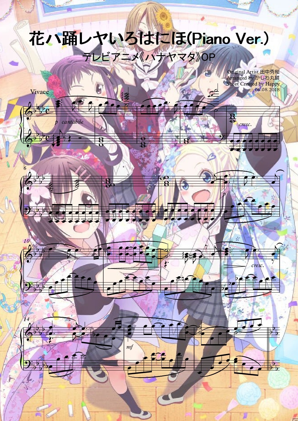 [IMG]/pu/2018/8/6/__2113_22499_[/IMG] 【 首先声明:这个不是我编配的,我只是截屏然后制谱。主要涉及到一些细节上的改编,指法的加入,和弦符号的删减,升降号重写以及美(zao)化(ta)谱面。最终解释权归视频原作者 かしわ丸餅 所有,请勿用作商业用途。原视频链接:/watch?v=  】以下为演奏注释【和弦符号】原作者很良心,每个小节都标上了和弦符号,我觉得有点碍眼就给删了,想要拿来即兴的不要打我hhh 【指法】原谱面没标注指法,于是我加上了我啃这首曲子的时候用的指法做参考。不得不说,还挺难弹好的。。。光练熟就花了我将近2个月的时间。。。大神另说【和弦重写】如第13小节左手前两个八分音符原本用的是还原B与升F,和弦标注BMaj7(9,升11),修改成了降C和降G。相同类型的改动还包括第49和第94小节等。【踏板】踏板老样子请ad lib PS 谱面第2至6页的背景人物的名字首字是按番名ハナヤマタ顺序排列的 PPS 本曲试听为真人演奏
