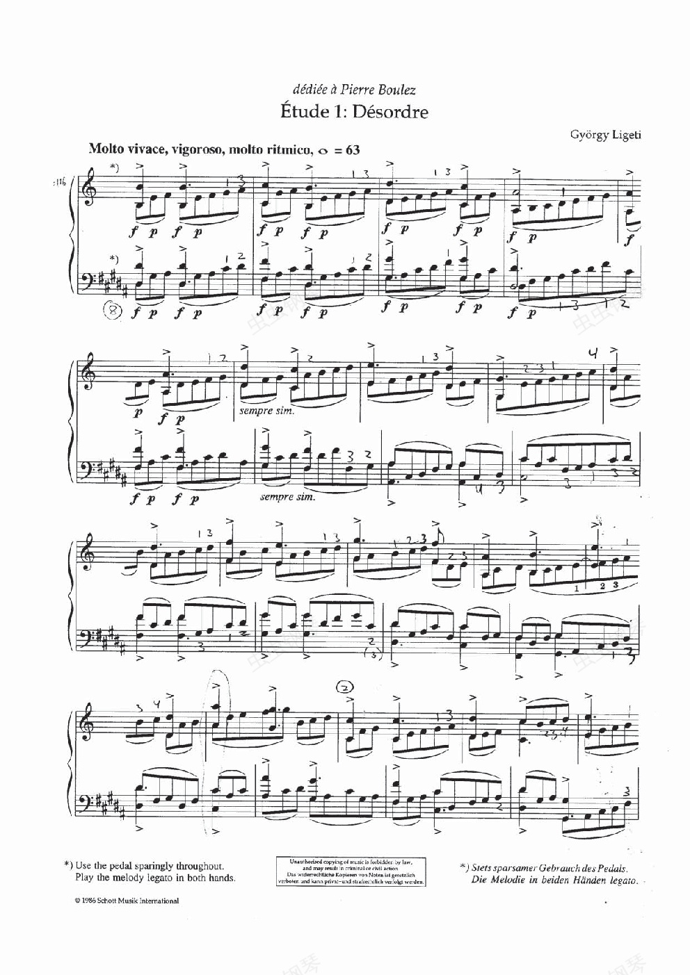 里盖蒂(1923—2006,),匈牙利作曲家;1923年5月28日生于持兰西瓦尼亚的迪乔圣马丁。是近代最重要的作曲家之一。他的钢琴练习曲是其著名作品之一。您现在看到的是他的第一首练习曲,采用了里盖蒂“微复调 ”技巧的一首多调性音乐。