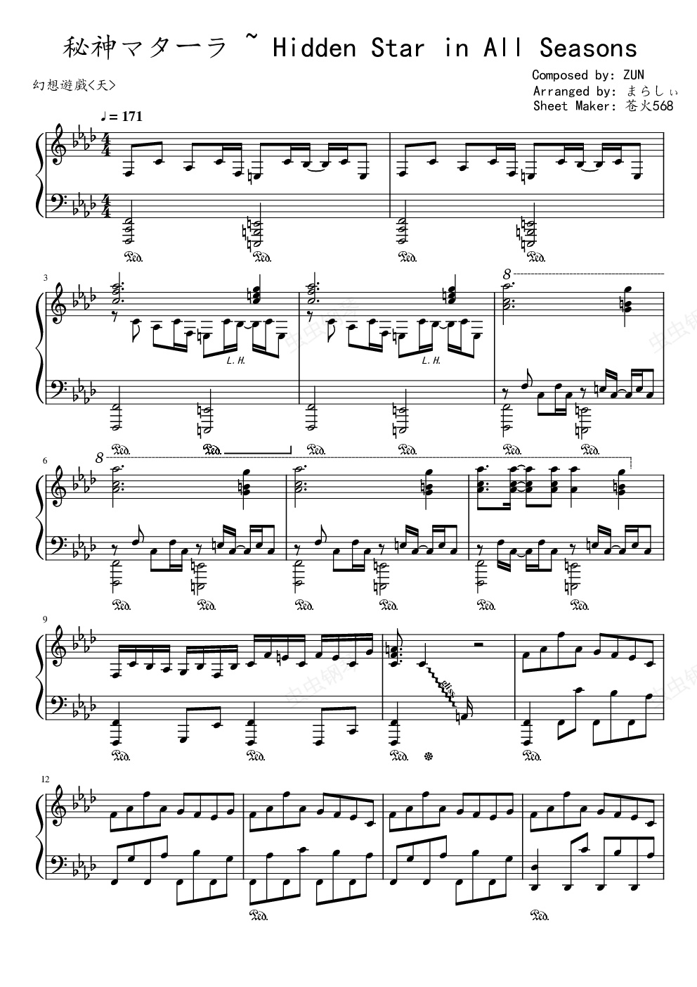 钢琴谱:【东方天空璋】【触手猴】秘神マターラ ~ Hidden Star in All Seasons
