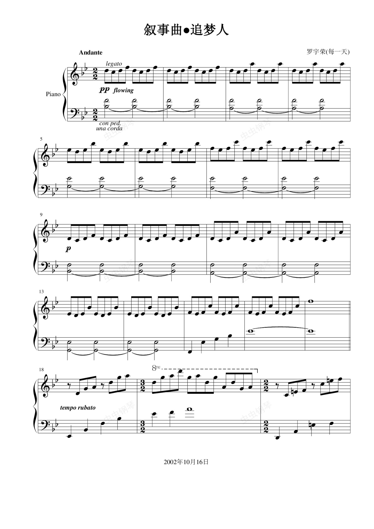 叙事曲●追梦人 作曲,编曲,弹奏:每一天 2002年10月16日 叙事曲简介 1-36小节 追梦人的梦想 37-69小节 为追求梦想而努力 70-85小节 遇到挫折而悲愤 86-115小节 继续努力 116-122小节 突然有转机 123-168小节 梦想成真的喜悦 此曲是2002年香港中文大学综合晚会之主题曲, 又名, 每一天曾以表演嘉宾身份于当晚弹奏此曲, 本试听录音也在当时播放过. 其后此曲为内三首原创曲目之一, 琴书曾登上香港商务印书馆音乐类畅销书榜. 现于虫网发谱留为纪念, 想来现在弹奏的风格也有所改变, 奏不出当年的冲劲了. 音乐记录历史, 这曲子大概只有创作人自己听起来, 才有最深刻的感受. 然而非常感谢所有支持这首曲子的人. 多谢!