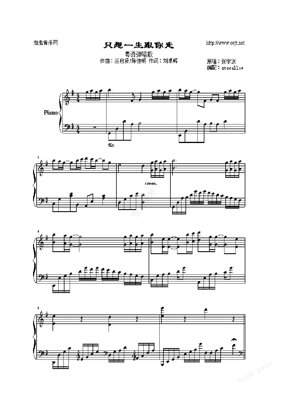 钢琴谱:只想一生跟你走