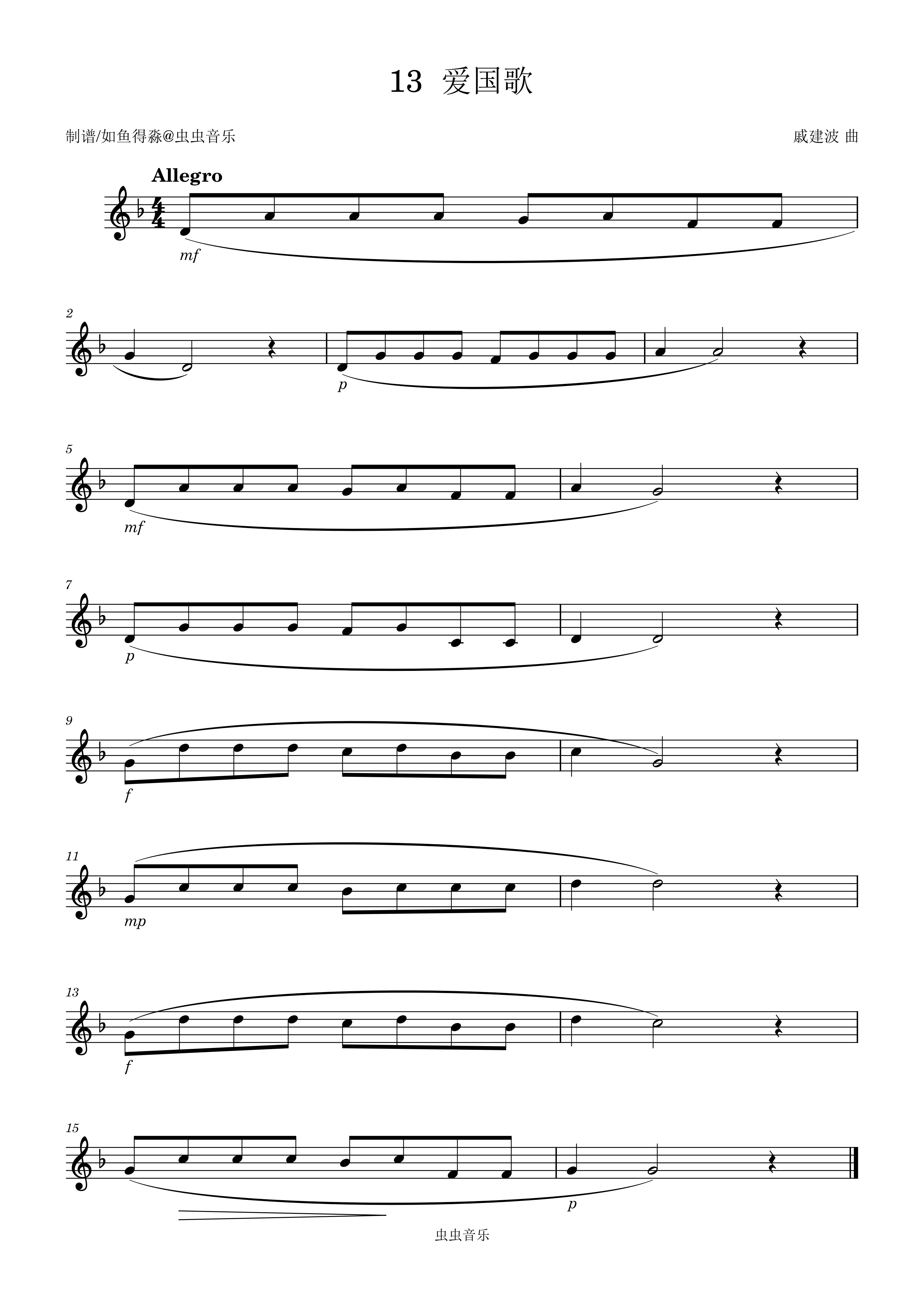 《视唱练耳考试曲13 爱国歌》是中央院音基演唱的一首歌曲,由央院作词作曲,本曲为F调(附和弦)适合所有同学演奏和学习