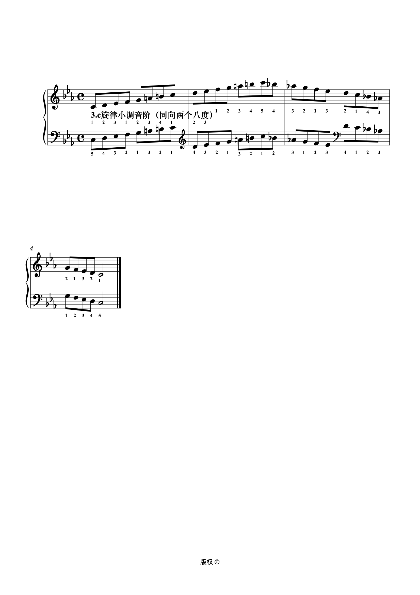 钢琴谱:14-1-3.c旋律小调音阶(同向两个八度)