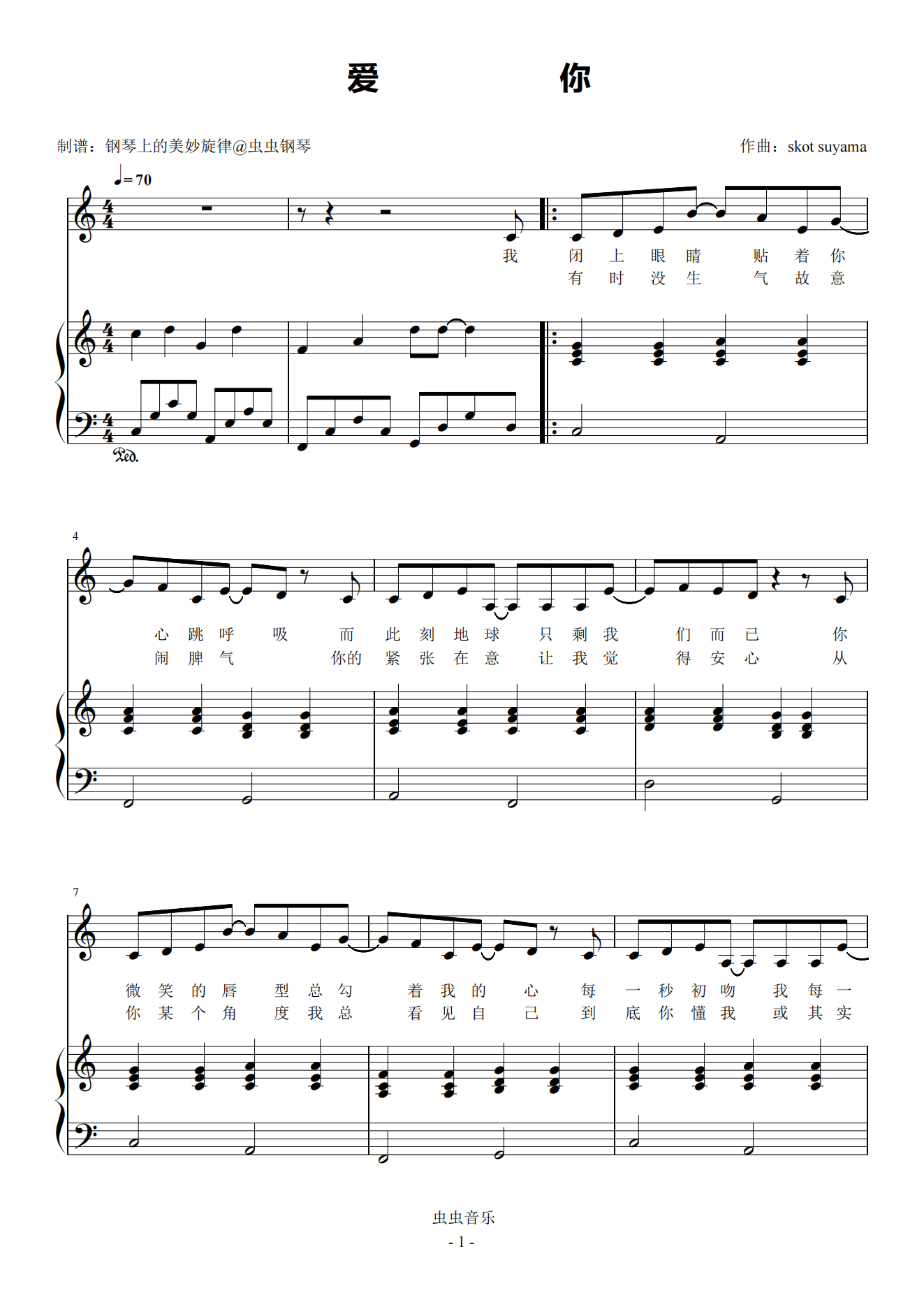 • 我爱你,中国钢琴简谱 C调 数字双手