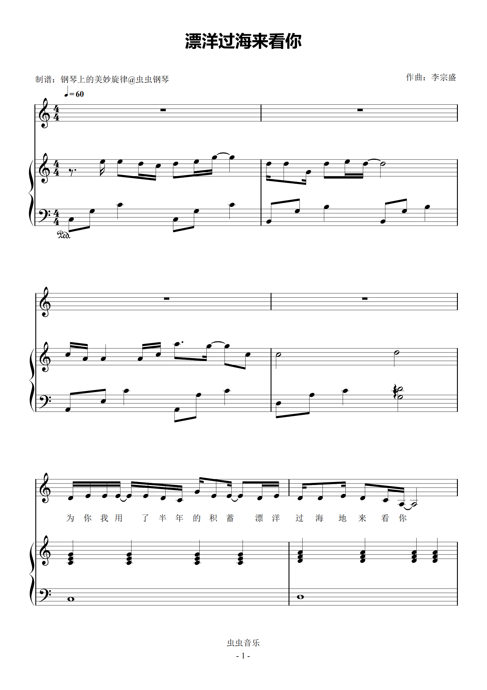 • 漂洋过海来看你钢琴简谱 C调 数字双手 李宗盛