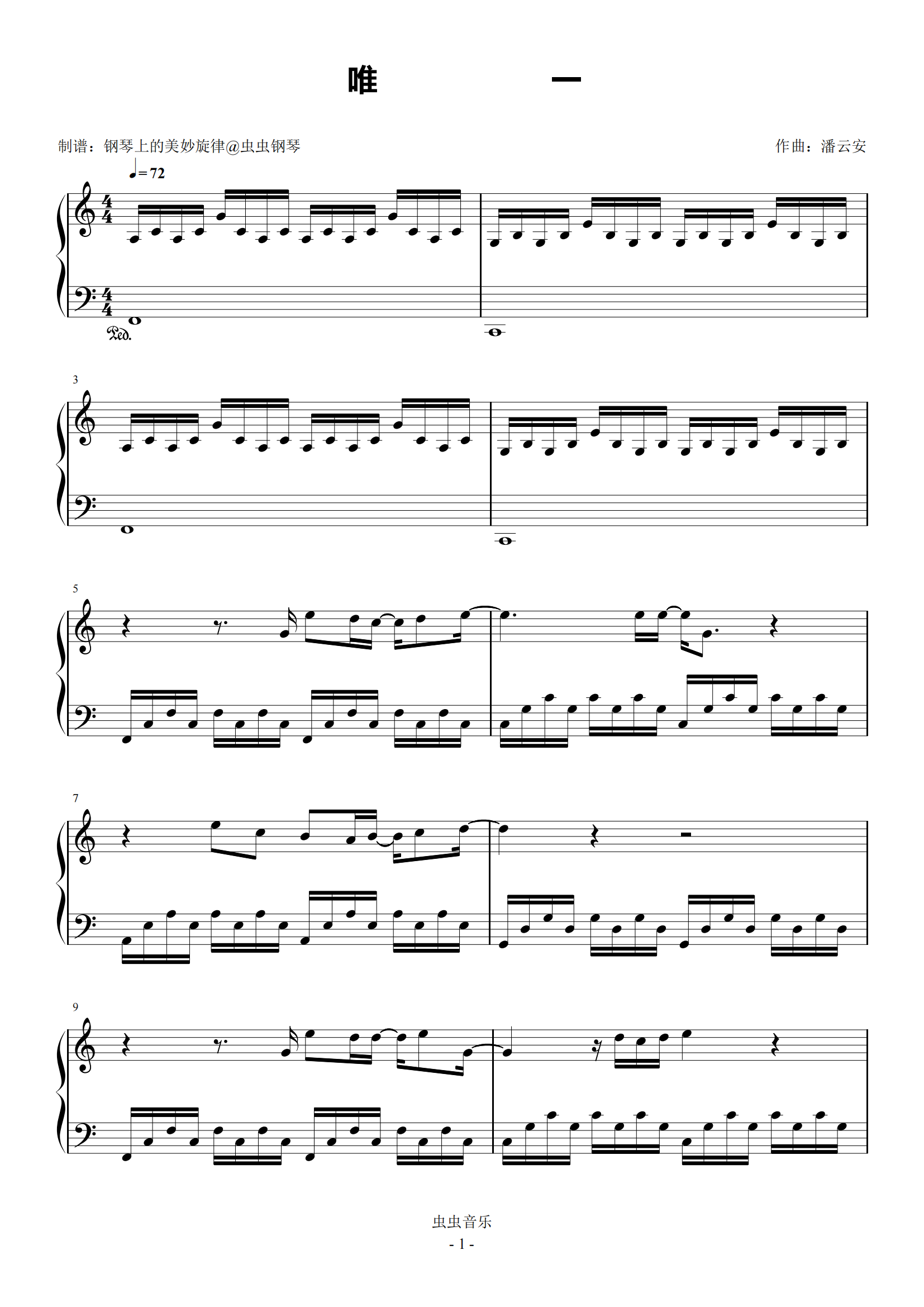 • 唯一钢琴简谱 C调 数字双手 潘云安