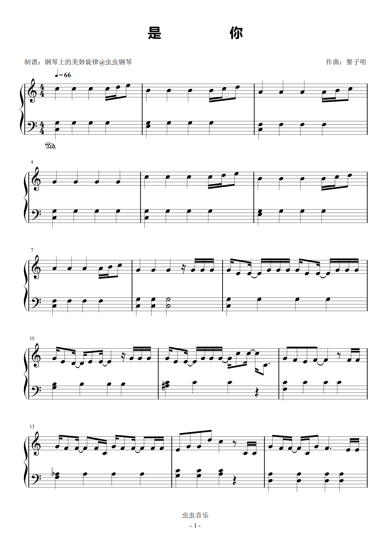 钢琴谱:是你 C调简易版 李宇春 难哄 电视剧