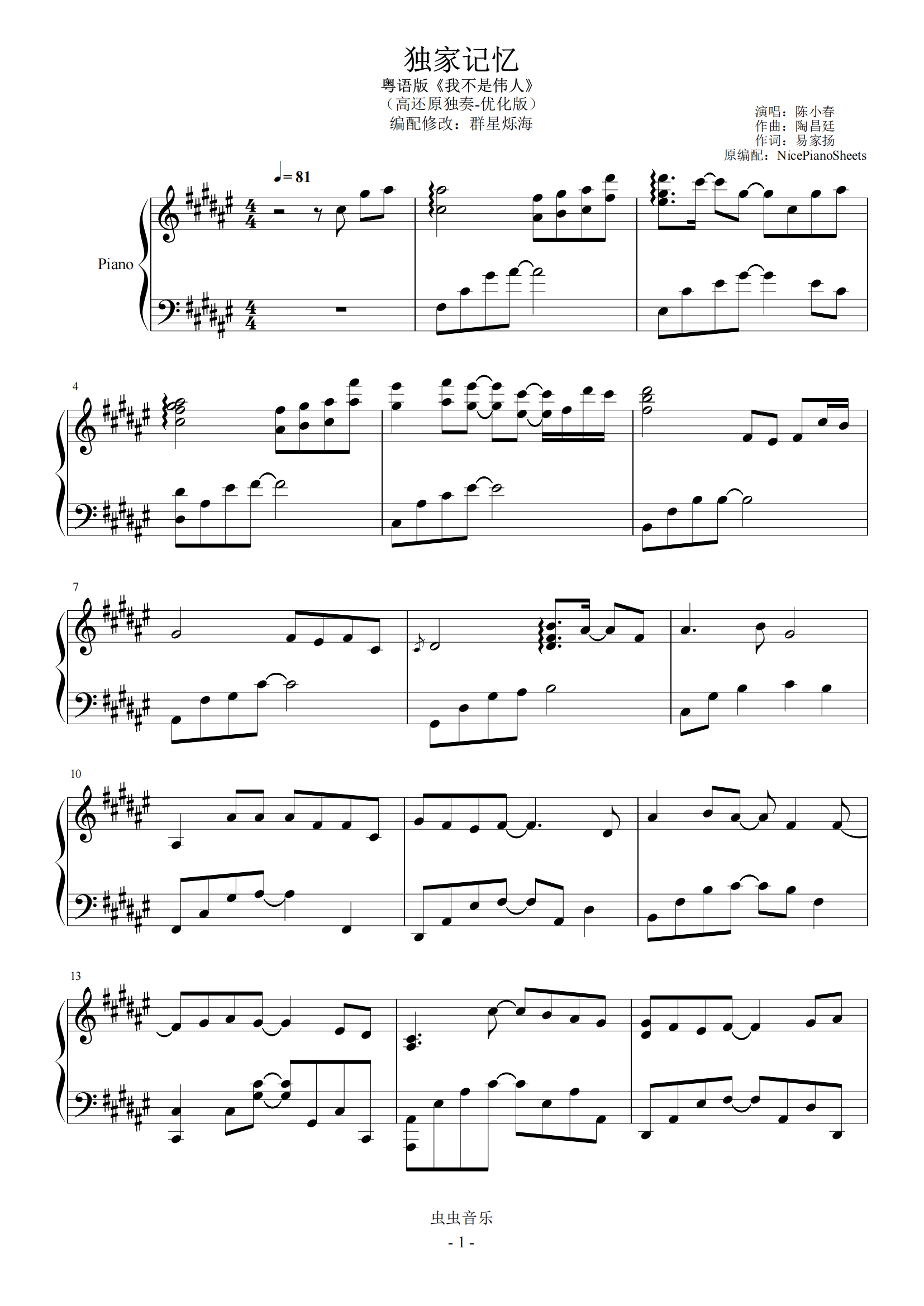 钢琴谱:《独家记忆》高还原独奏版(我不是伟人 陈小春)