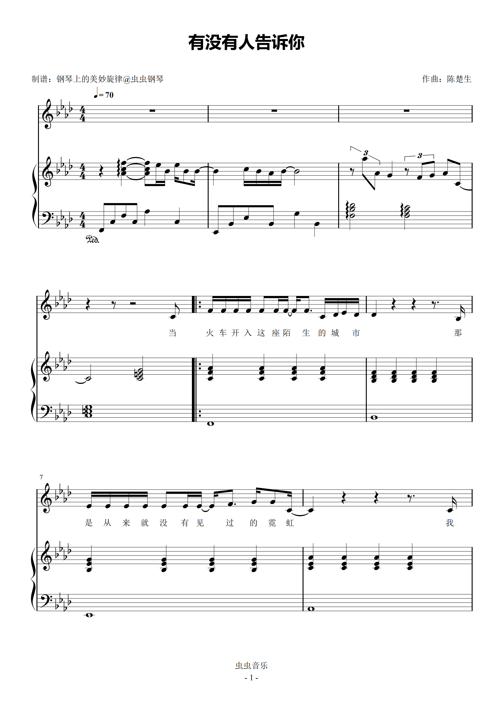 钢琴谱:有没有人告诉你 简易钢琴弹唱伴奏 带歌词 陈楚生