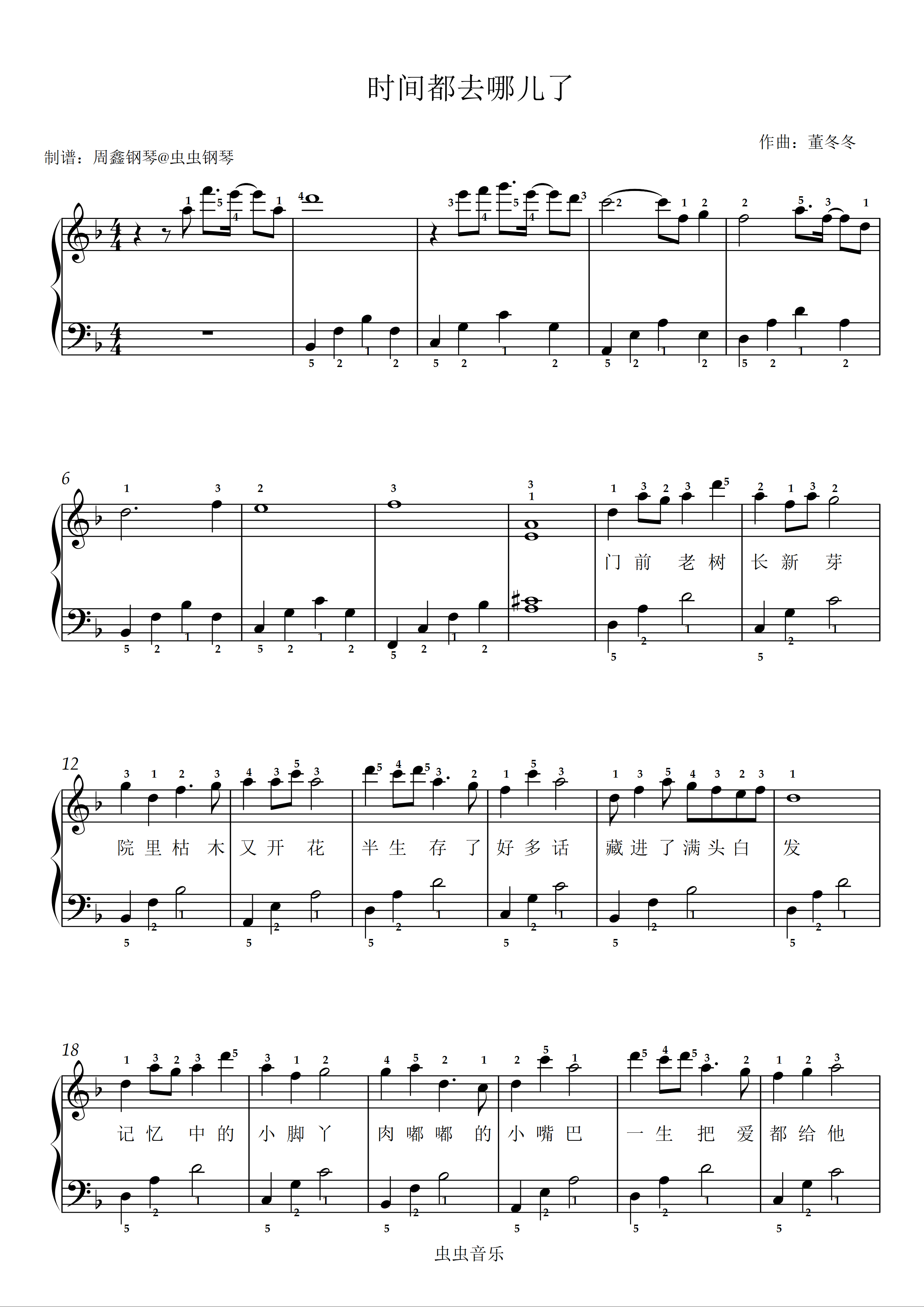 钢琴谱:《时间都去哪儿了》F调 带指法 带歌词 简单版