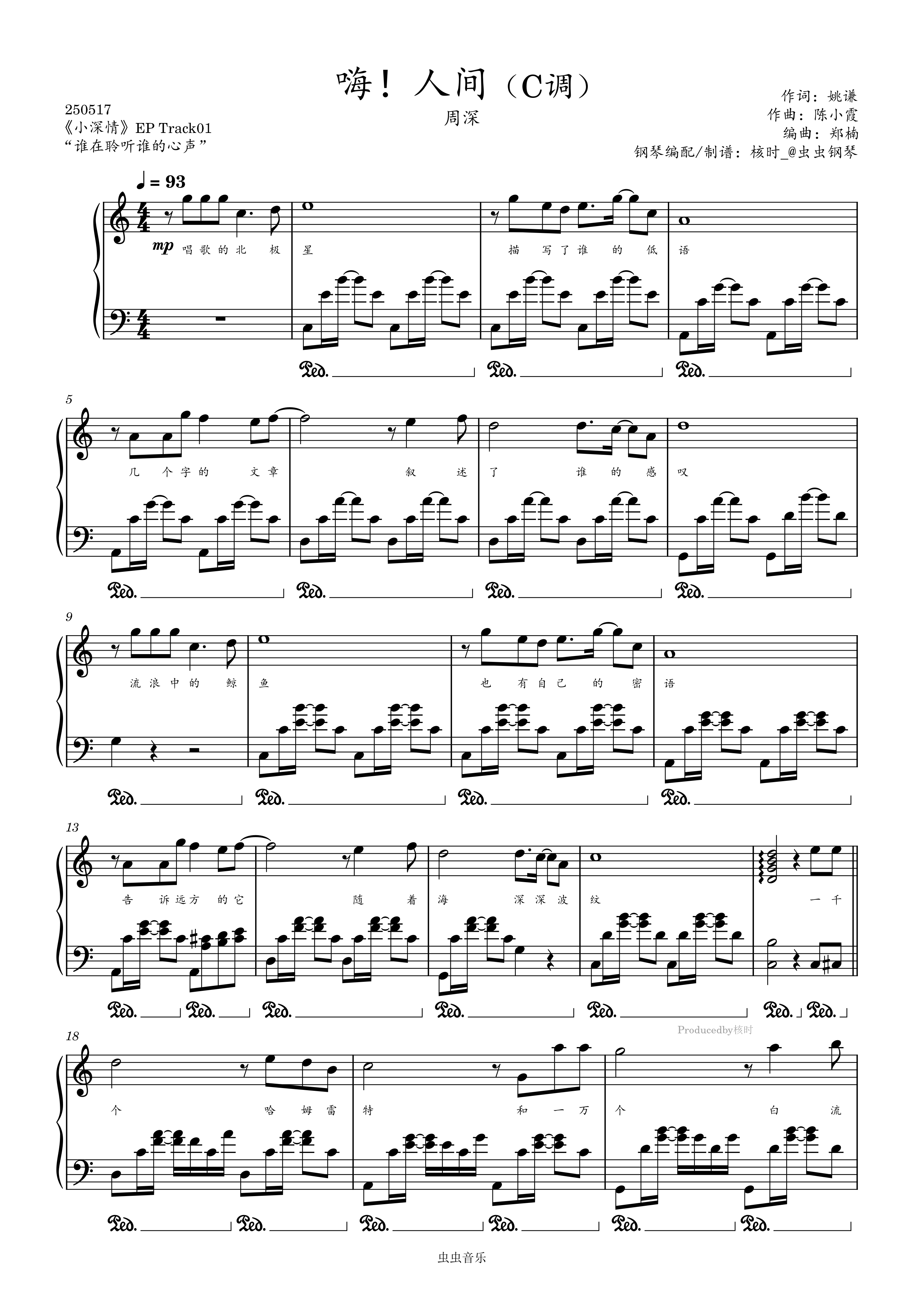 钢琴谱:嗨!人间(C调,周深专辑《小深情》,完美独奏)【核时完整精编】