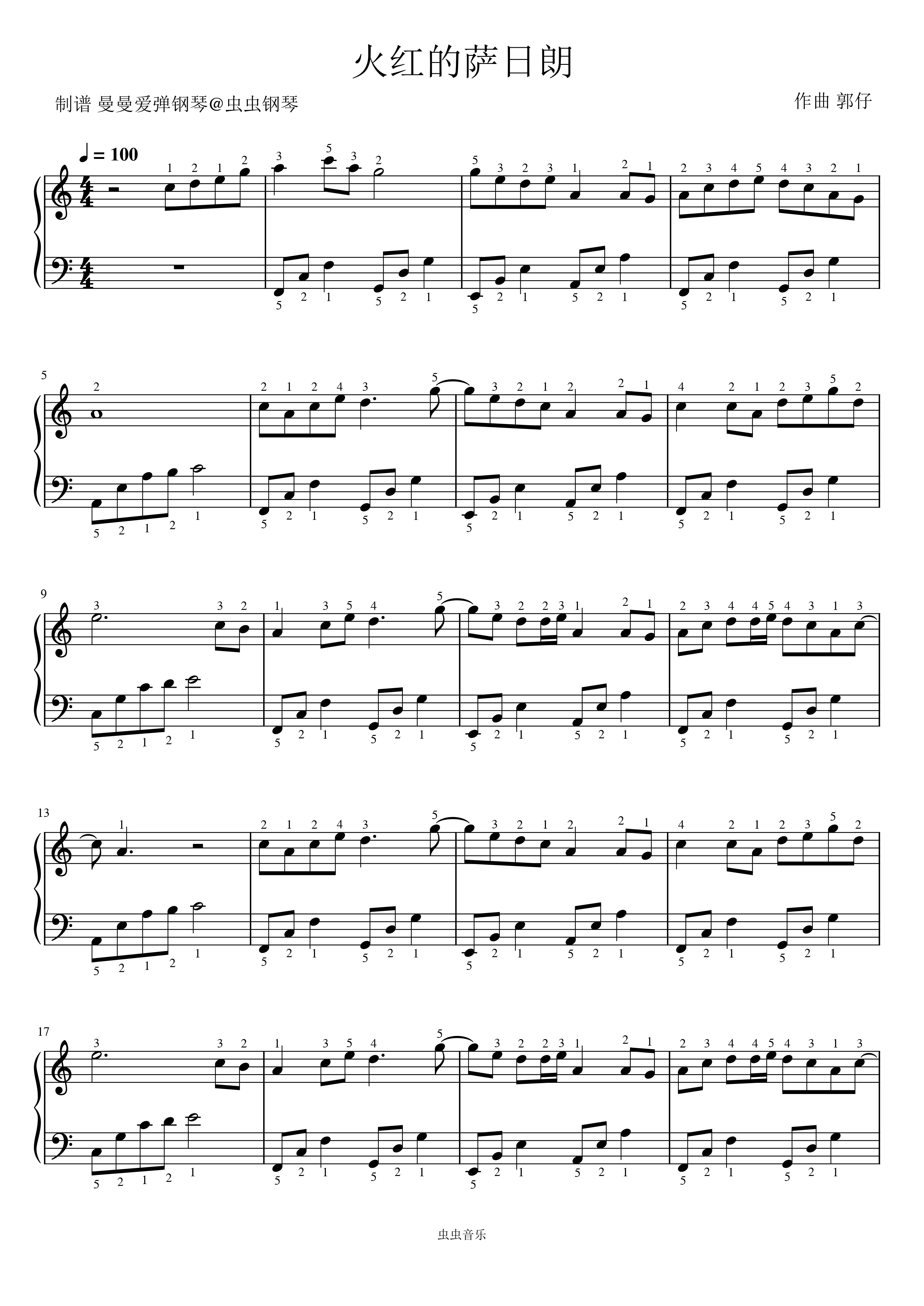 钢琴谱:《火红的萨日朗》C调 简易 好听 好弹