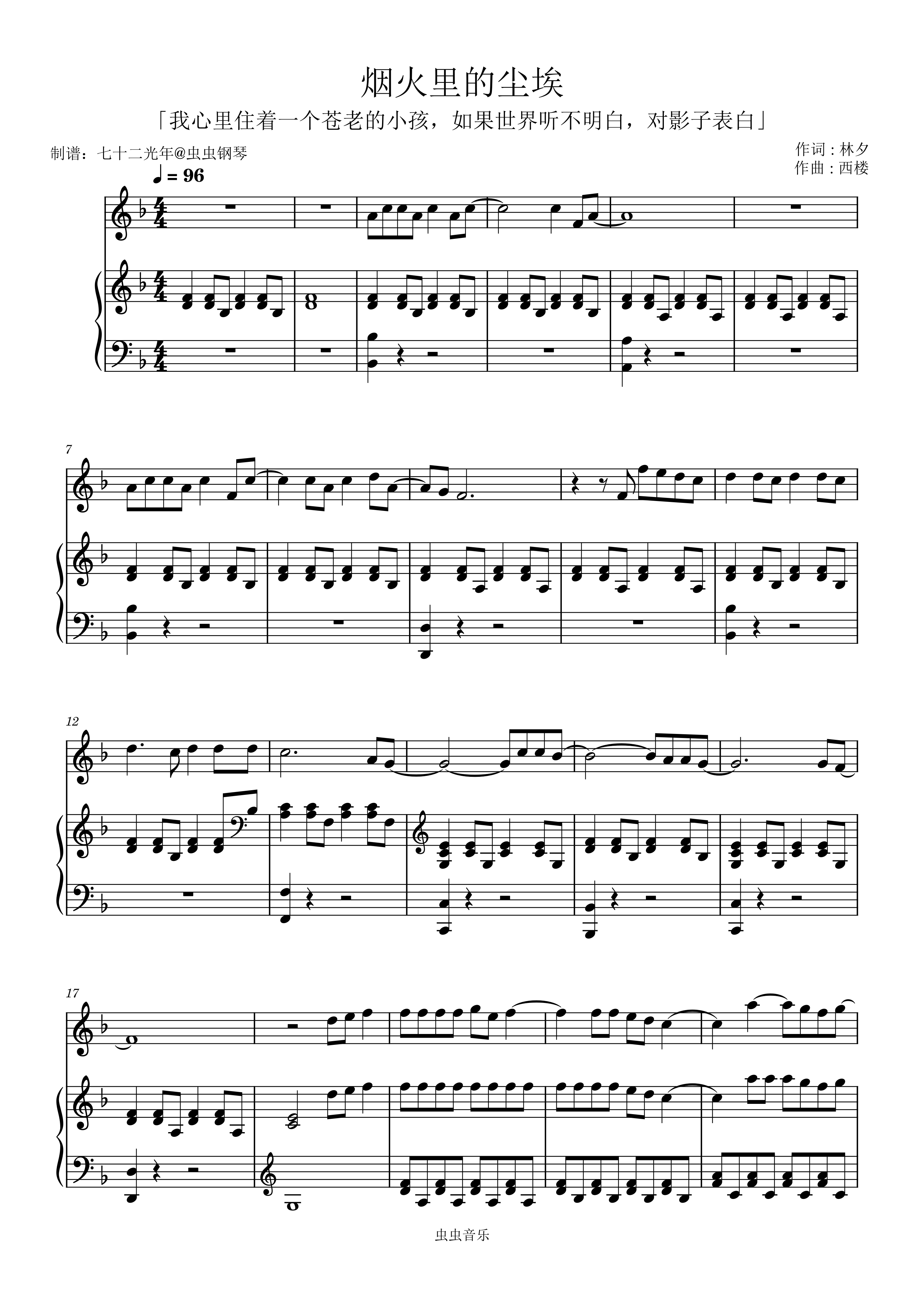 • 烟火里的尘埃钢琴简谱 d调 数字双手 林夕