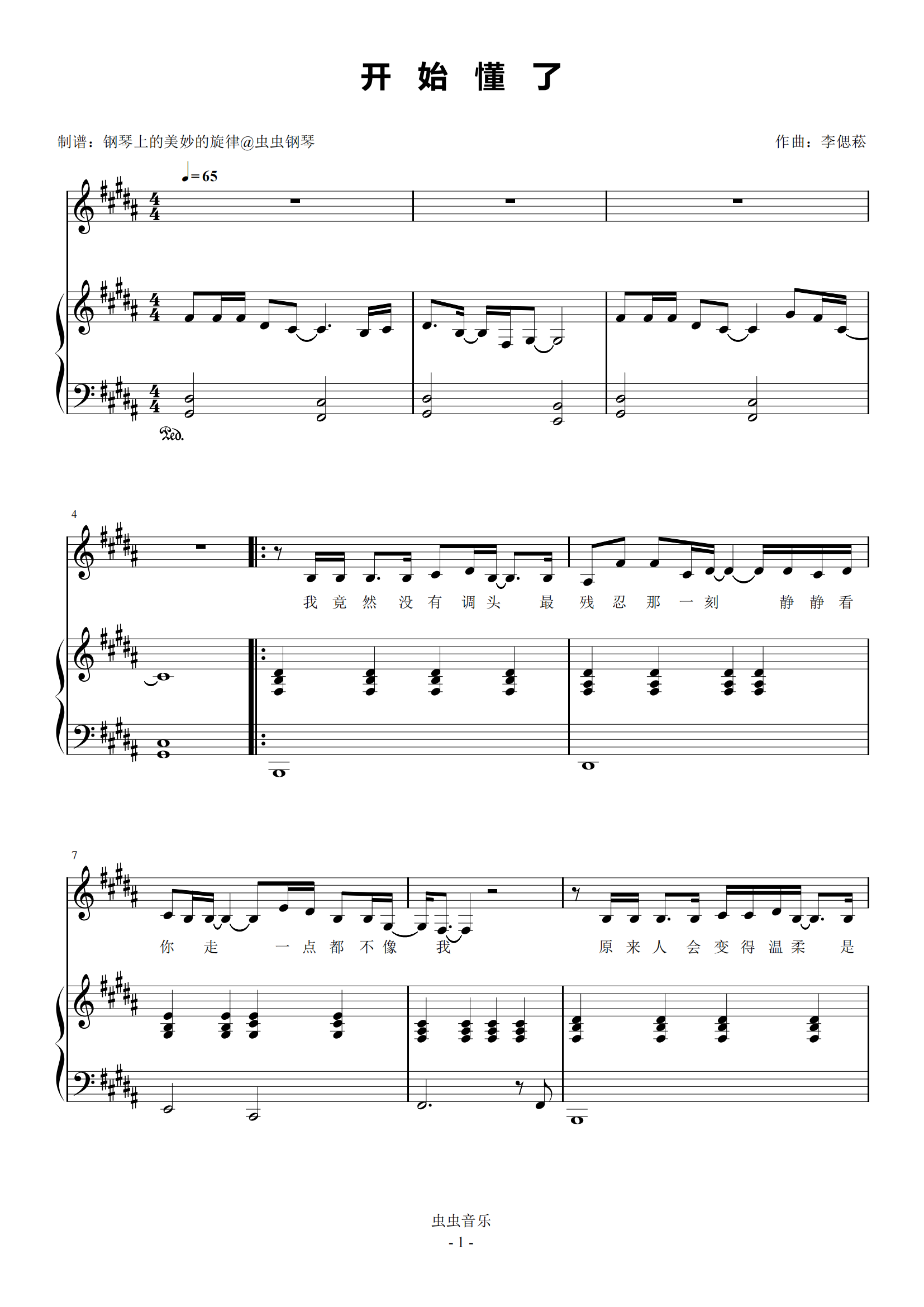 钢琴谱:开始懂了 原调简易钢琴弹唱伴奏 带歌词 孙燕姿